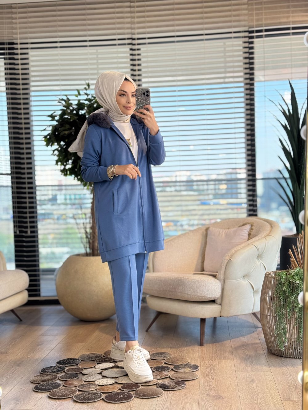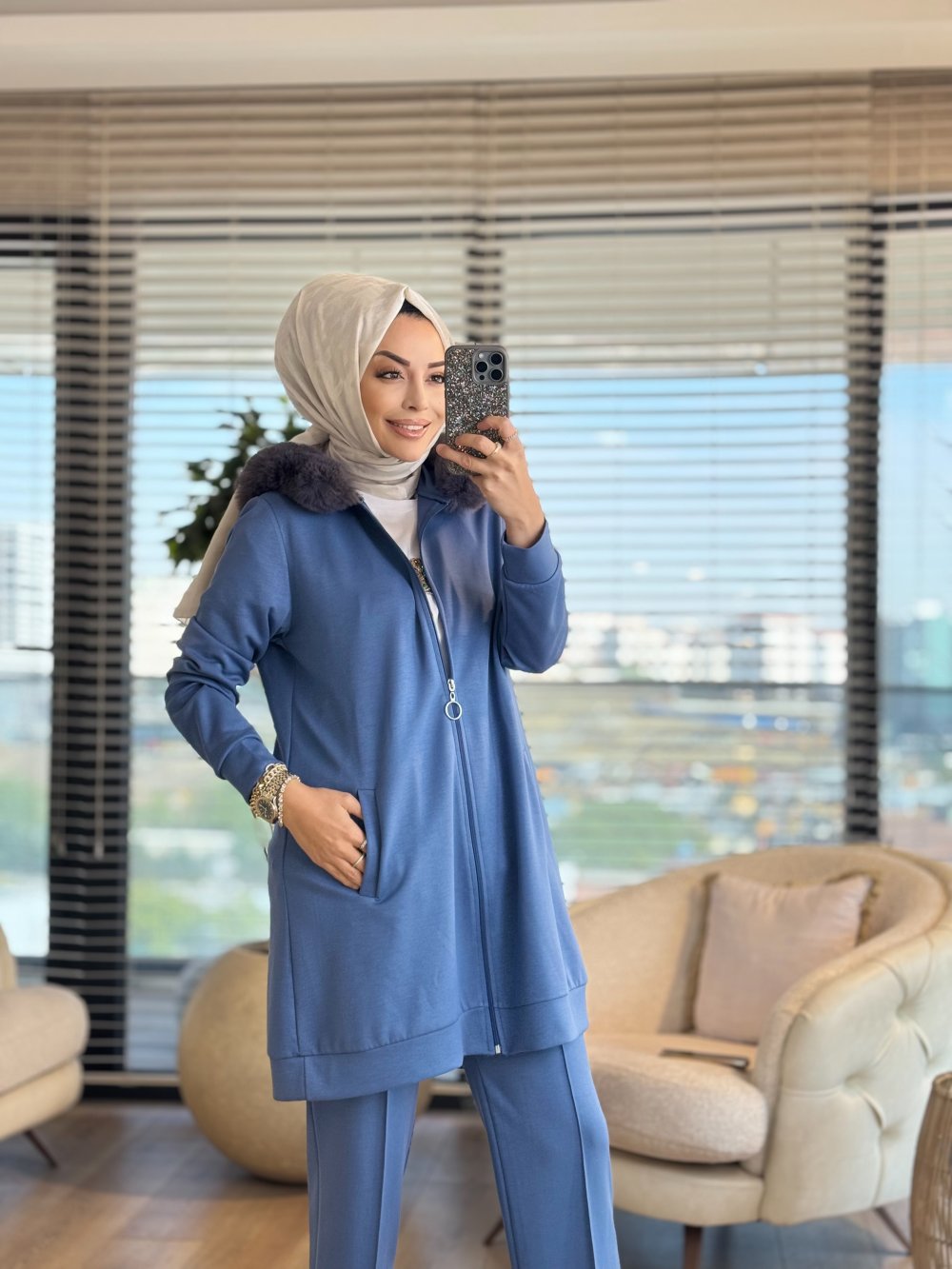 3950 Yaka Kürklü Fermuarlı Takım İndigo