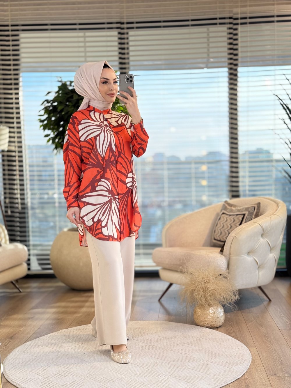 4016-9 Ege Büyük Çiçekli Tunik Oranj