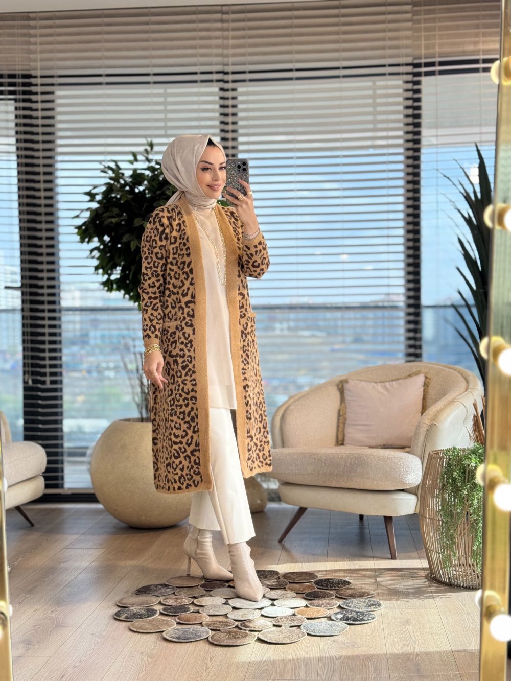 4143 Angora Leopar Desen Uzun Hırka Latte