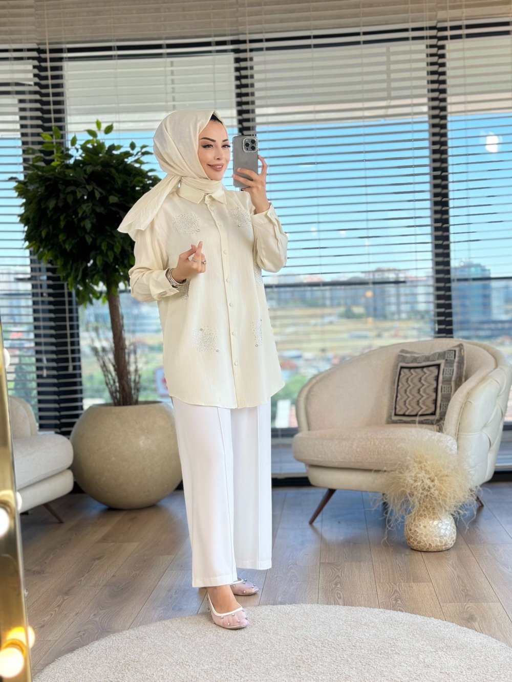 4275 Tencel Ön Taş Baskılı Tunik Ekru