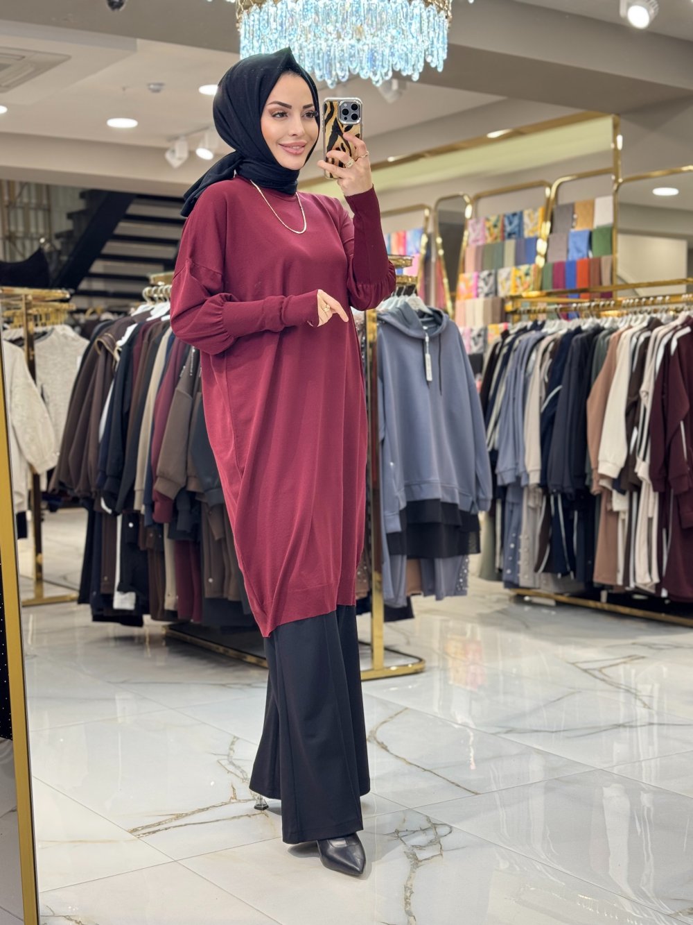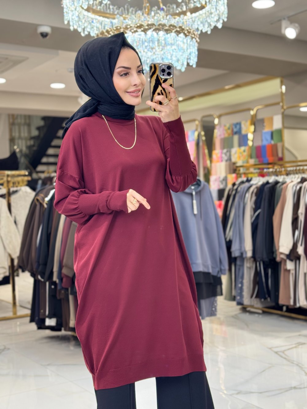 44221 Manşeti Lastikli Triko Tunik Bordo