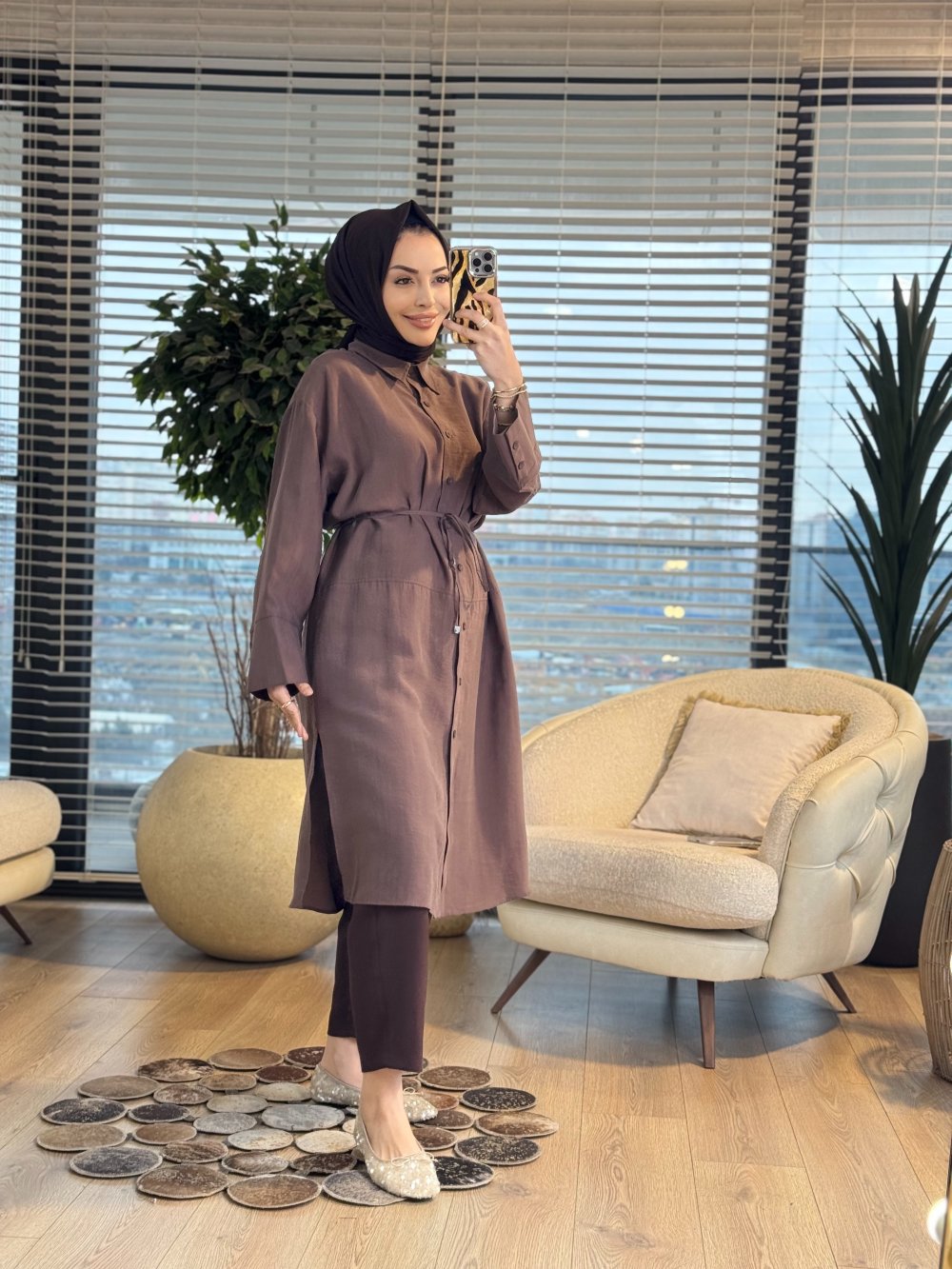 4476 Ön Düğmeli Klasik Uzun Gömlek Kahve