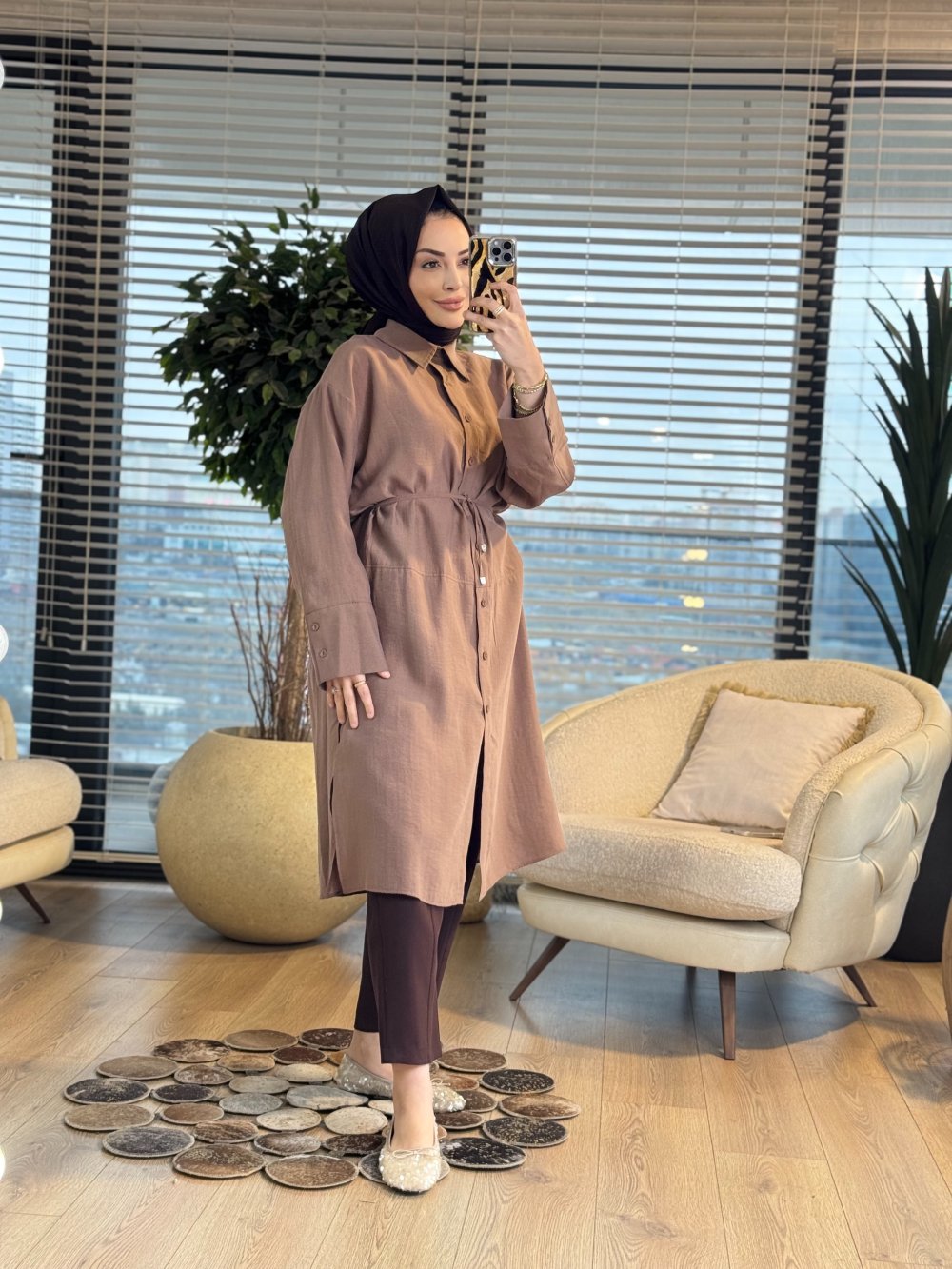 4476 Ön Düğmeli Klasik Uzun Gömlek Vizon