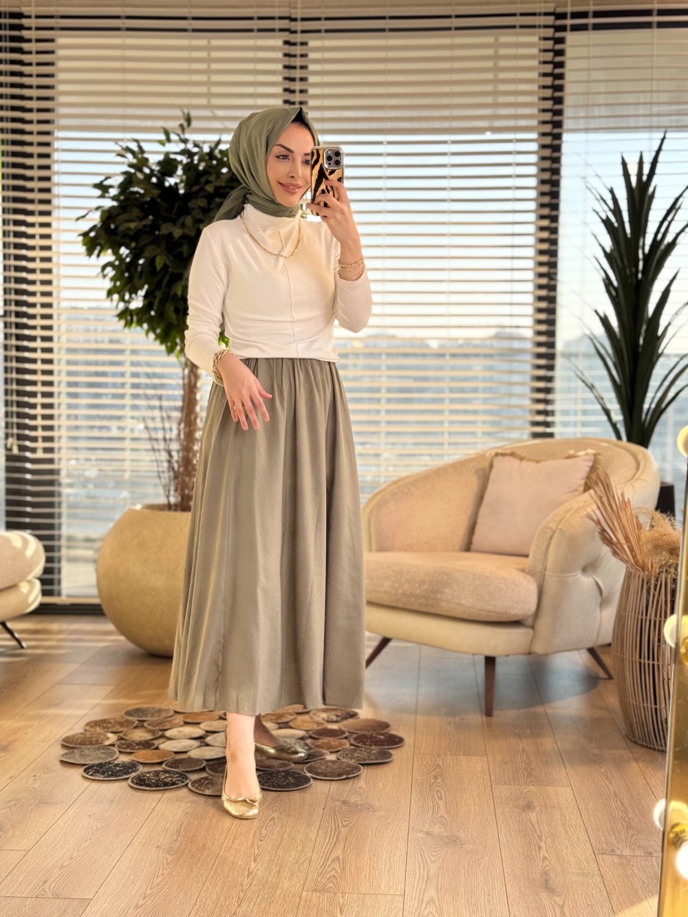 5036 Beli Lastikli Cepli Kırışık Etek Haki