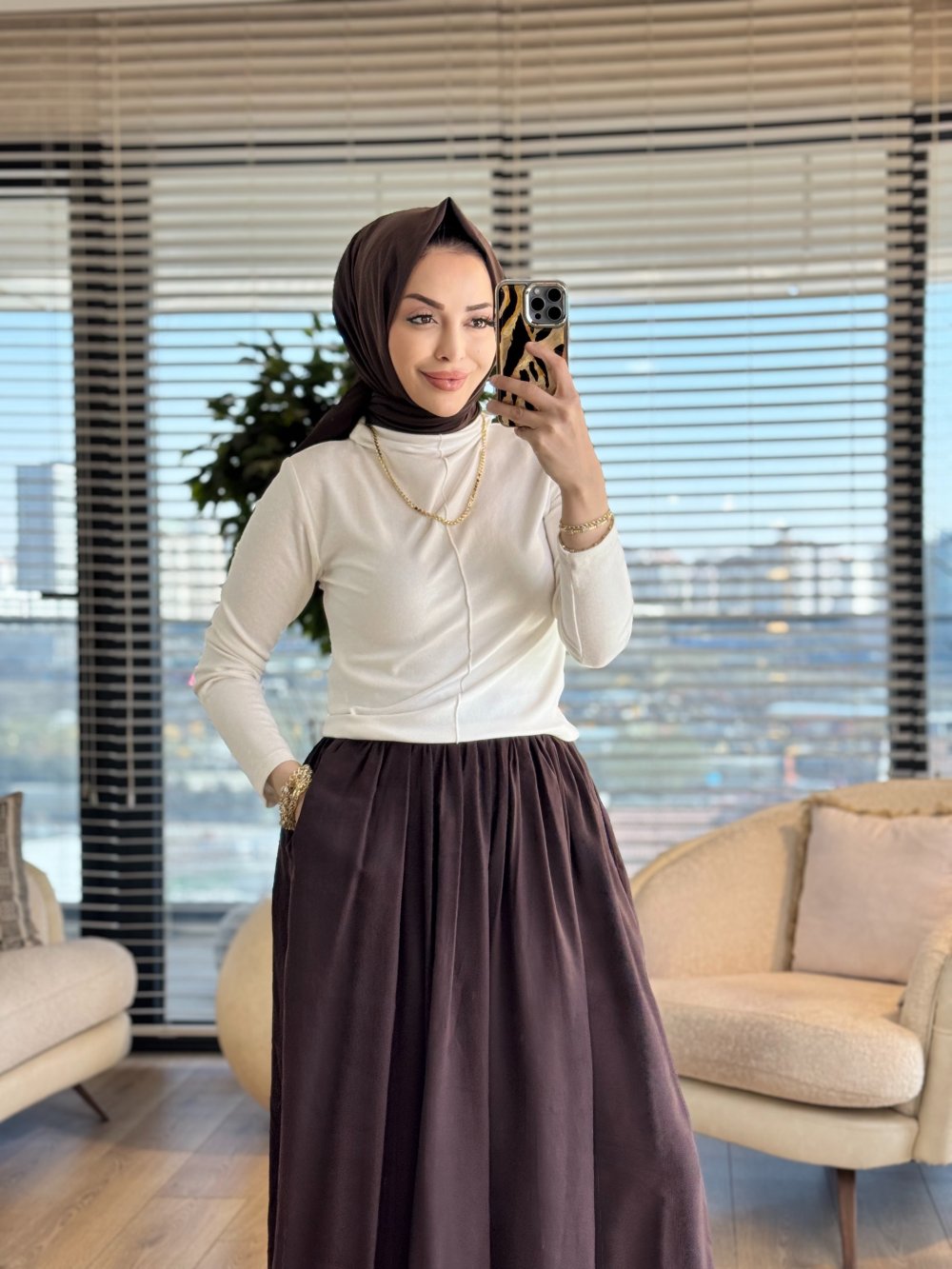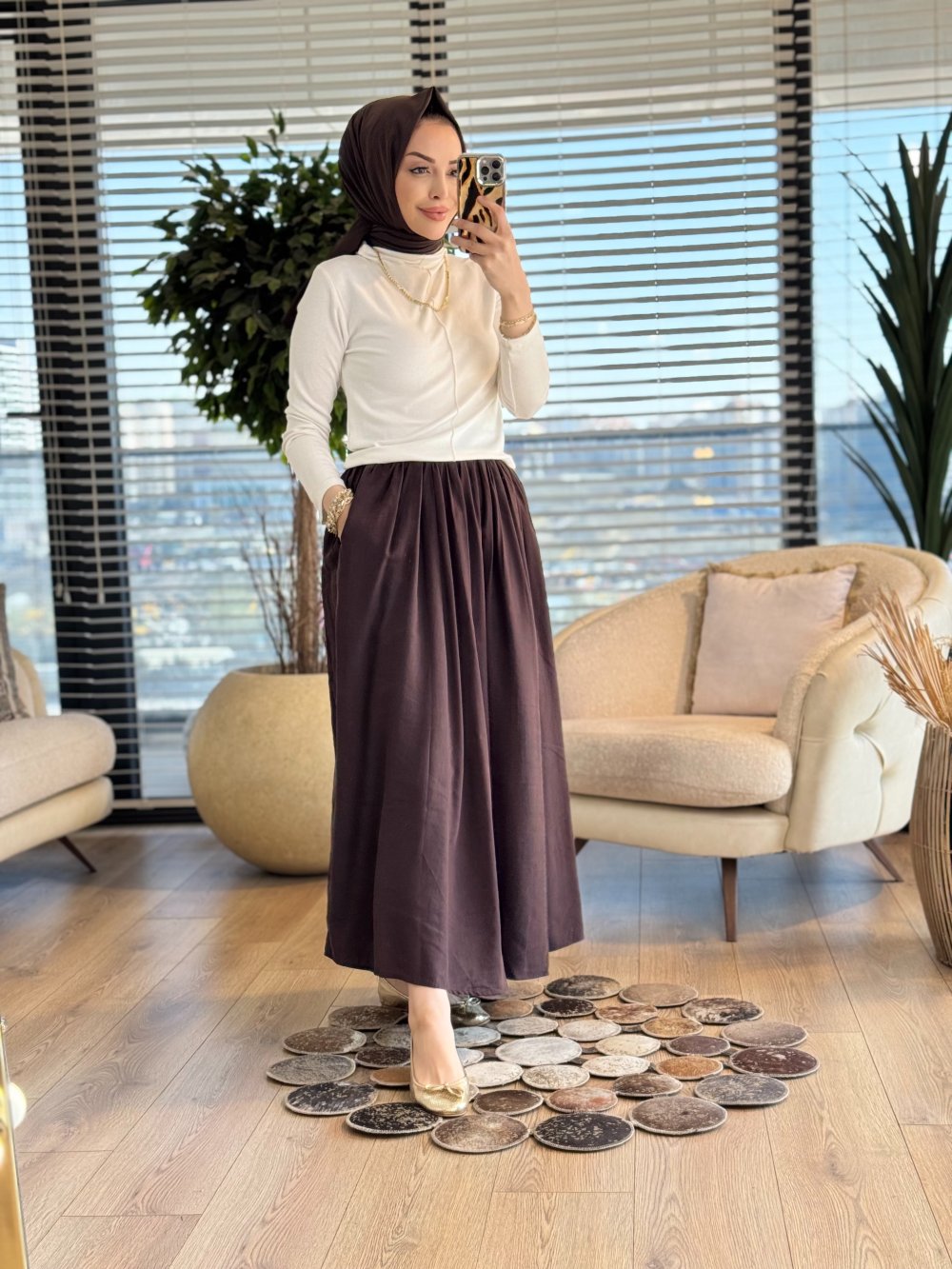5037 Bel Arkası Lastikli Cepli Etek Kahve