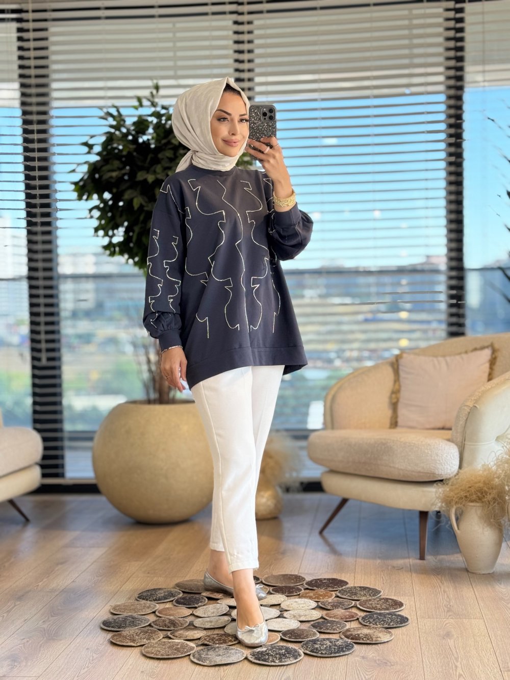 5521 Önü Kolu Çubuk Boncuk İşli Tunik Füme