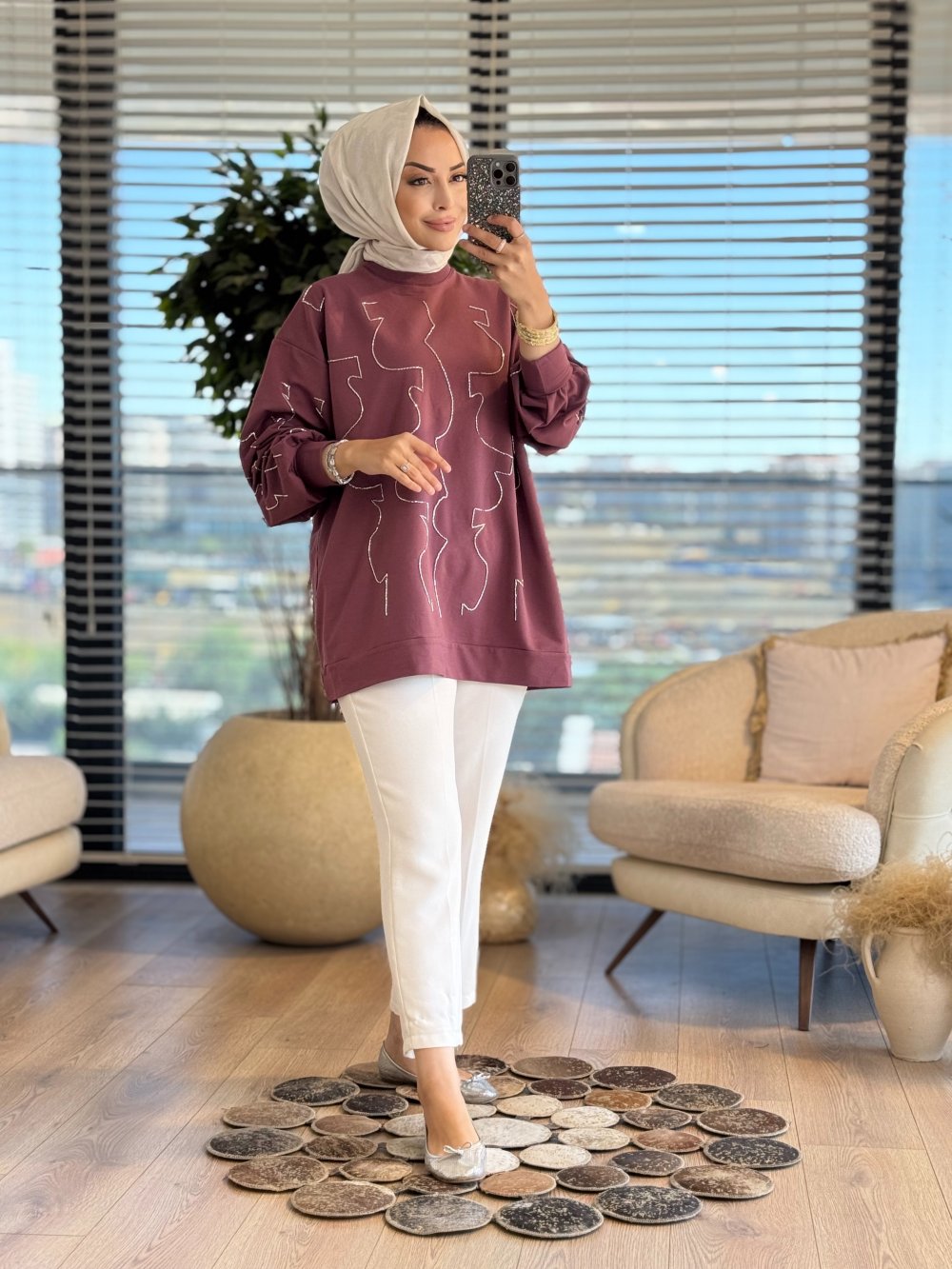 5521 Önü Kolu Çubuk Boncuk İşli Tunik Gül