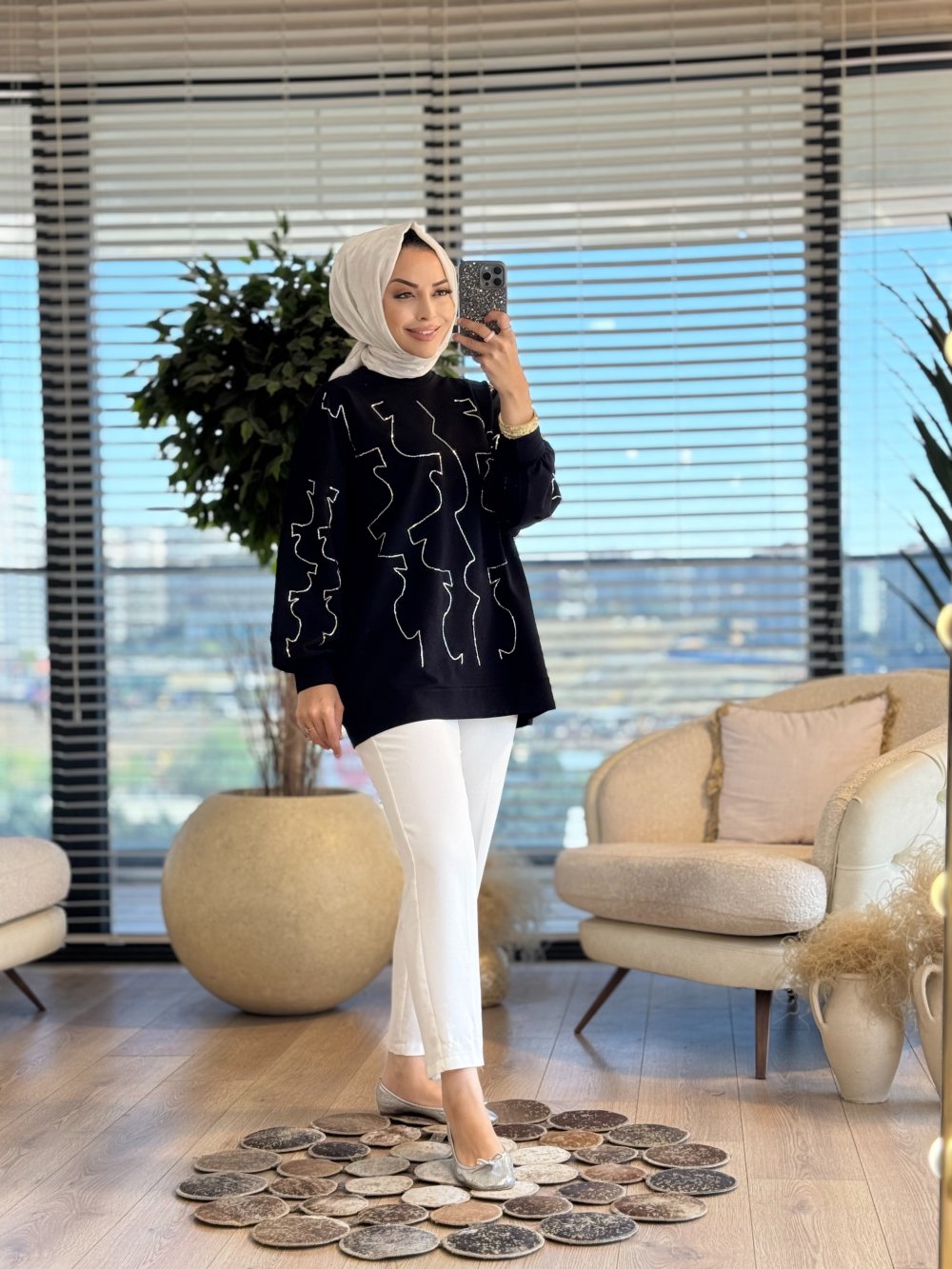5521 Önü Kolu Çubuk Boncuk İşli Tunik Siyah