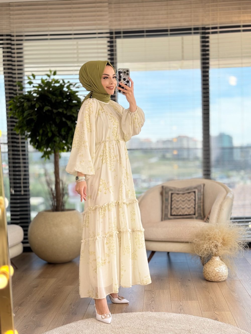 6277 Şifon Etek Ucu Fırfırlı Elbise Ekru