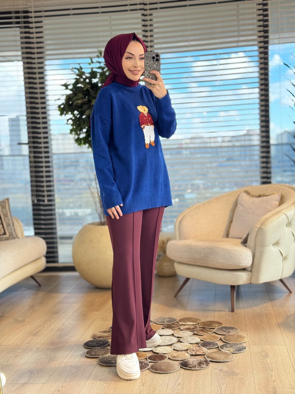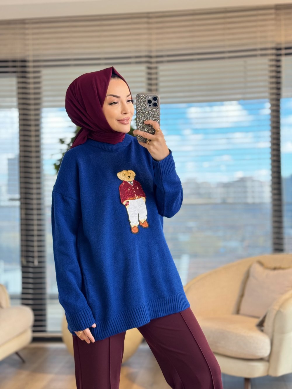 6505 Önü Ayıcık Nakışlı Triko Tunik Saks