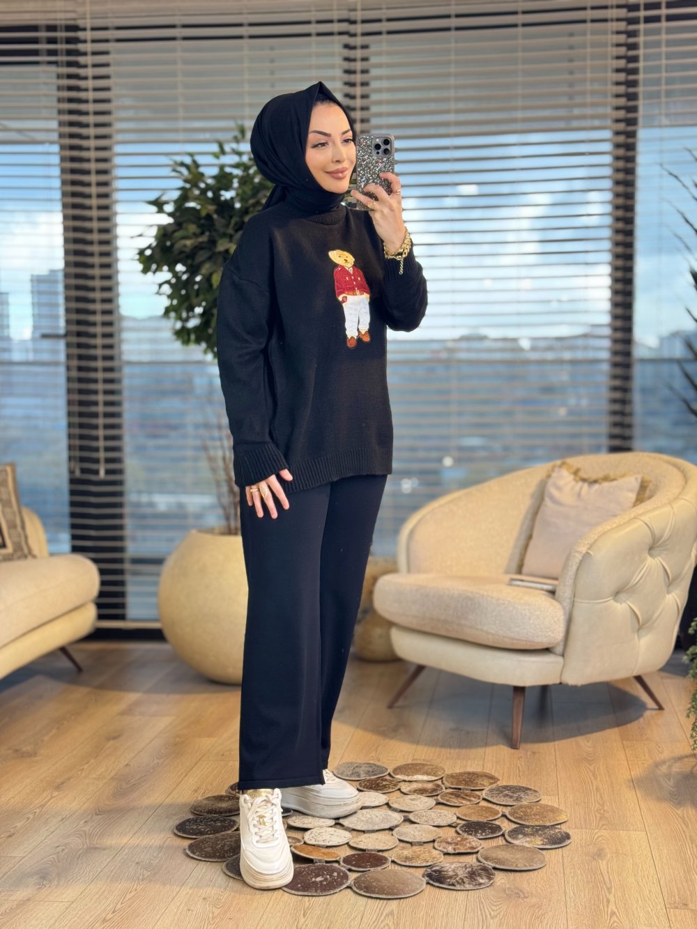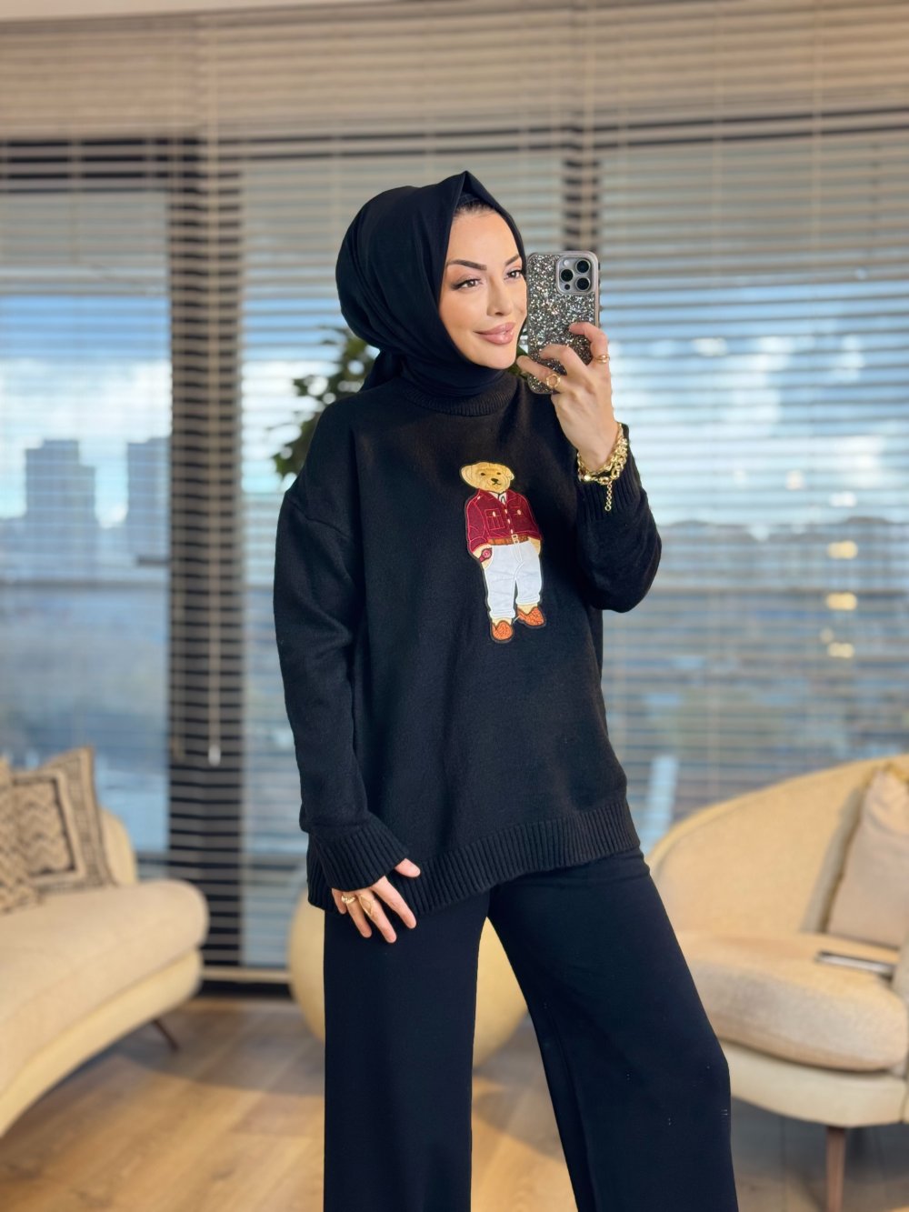 6505 Önü Ayıcık Nakışlı Triko Tunik Siyah