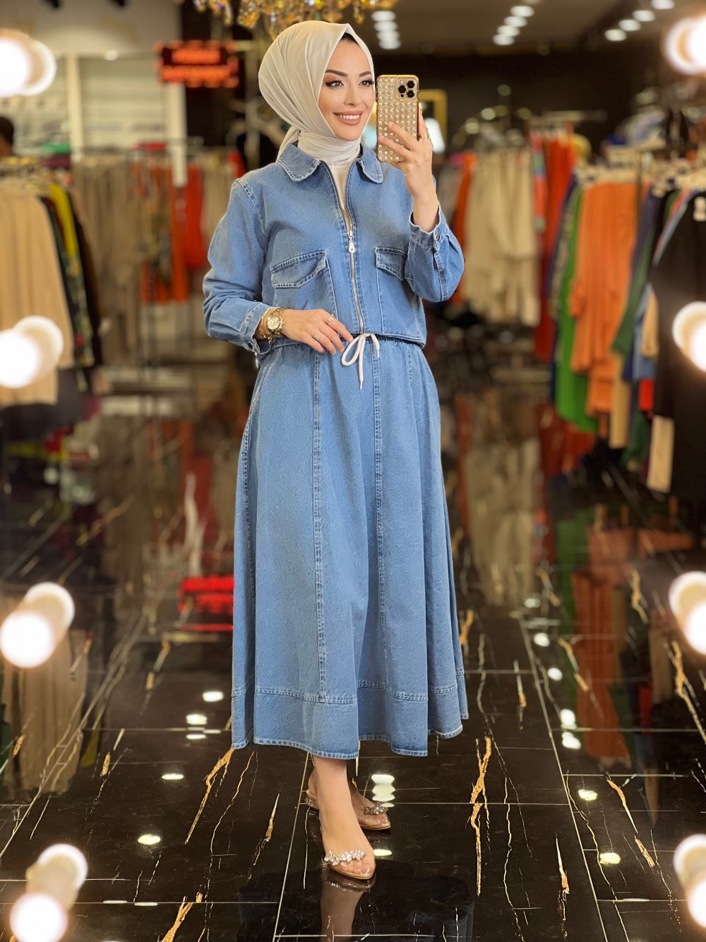 6877 Kot Önü Fermuarlı Etekli Takım Mavi