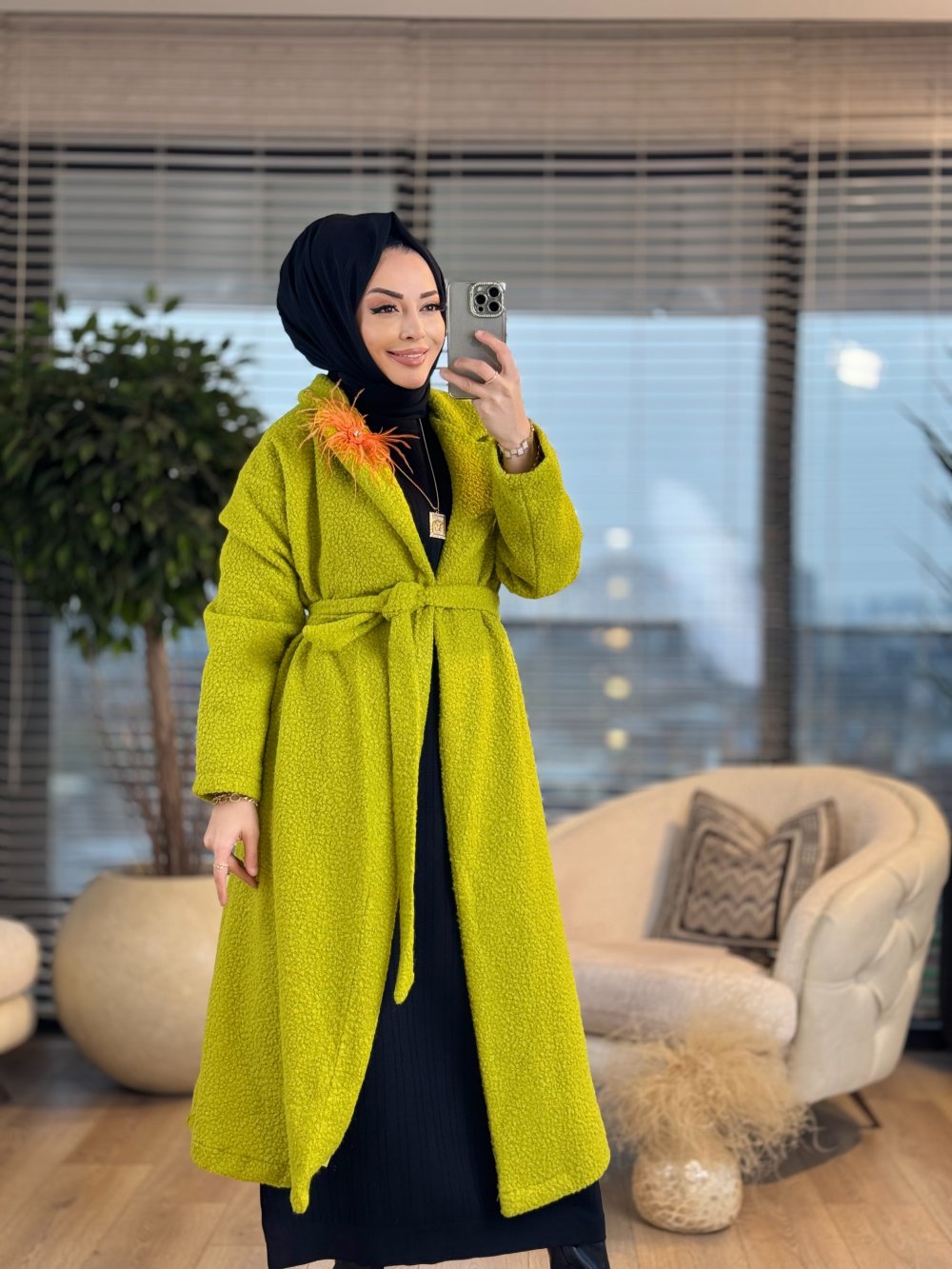 7023 Pelüş Beli Kemerli Kaban Yeşil