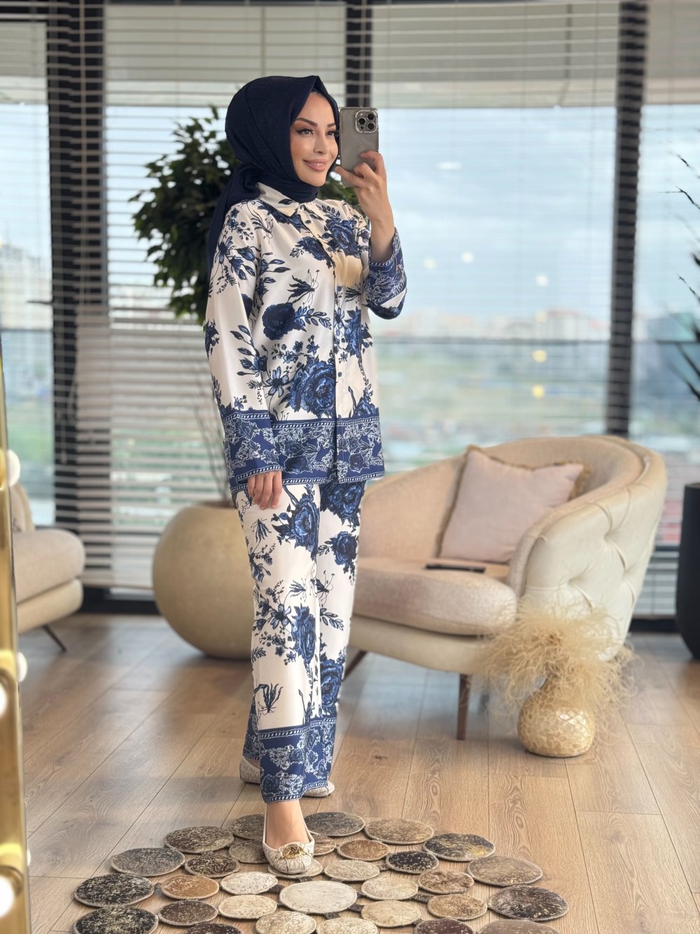 71086 Saten Gül Desenli Takım Lacivert