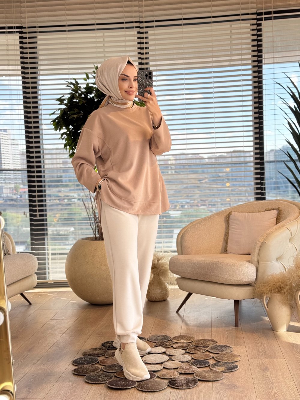 7398 Etek Ucu Parçalı Tunik Bej