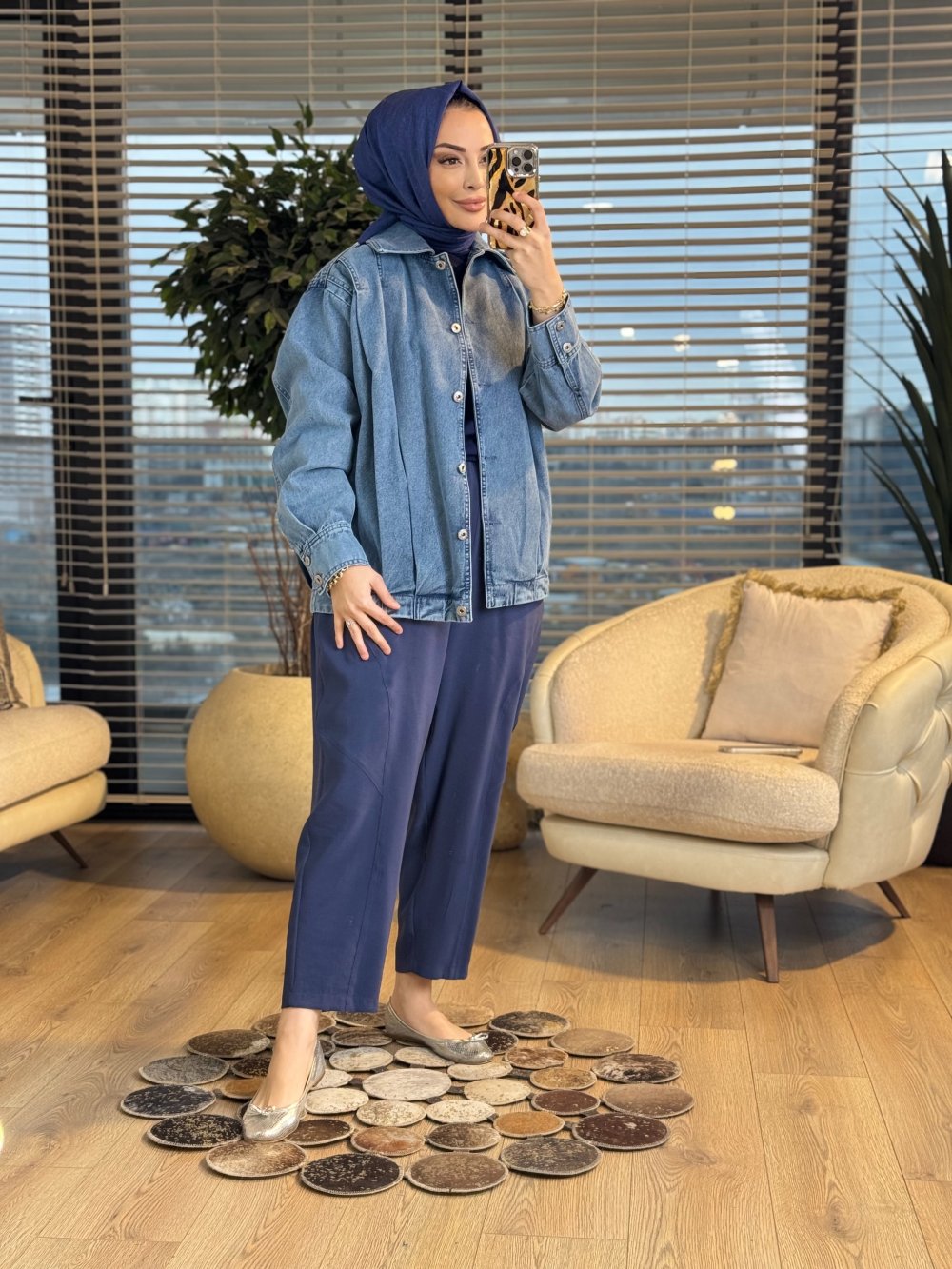 7458 Omuzları Pile Detaylı Kot Ceket Mavi