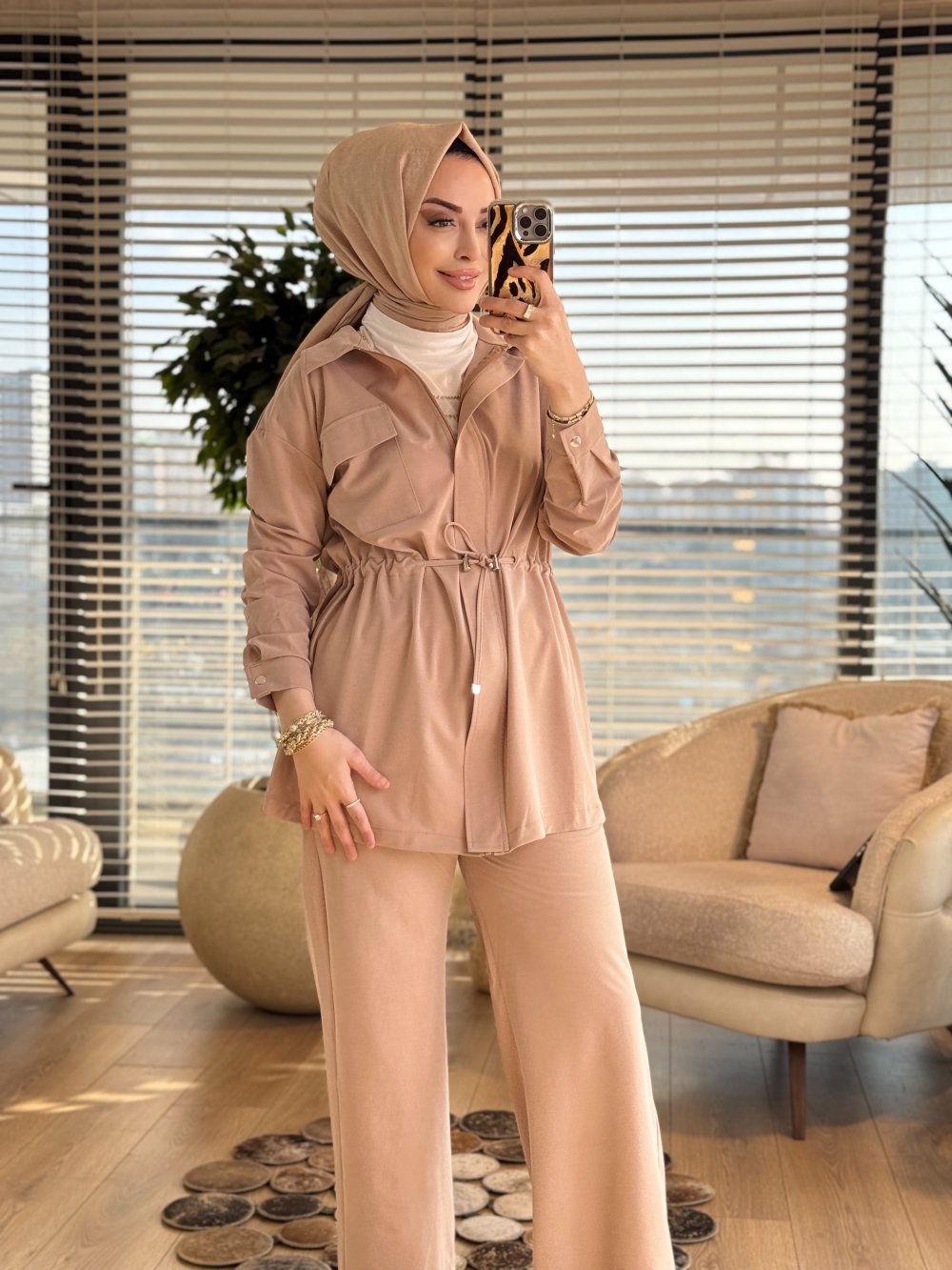 7459 Cepli Beli Büzgülü Takım Bej