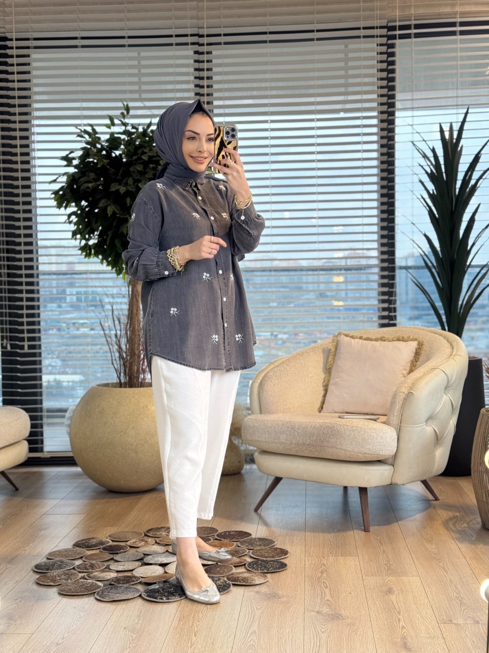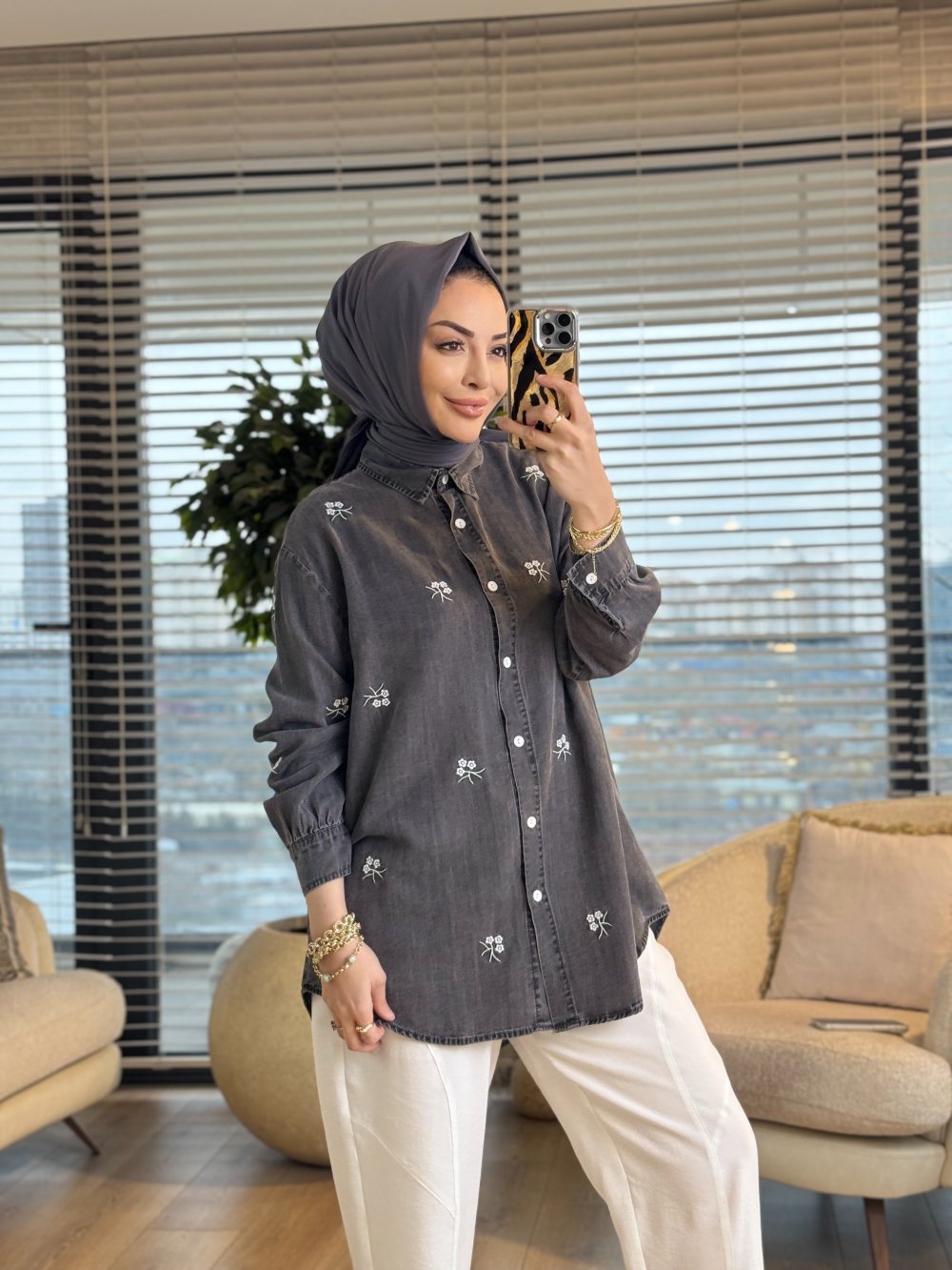 7476 Tencel Üstü Çiçek Nakışlı Gömlek Gri
