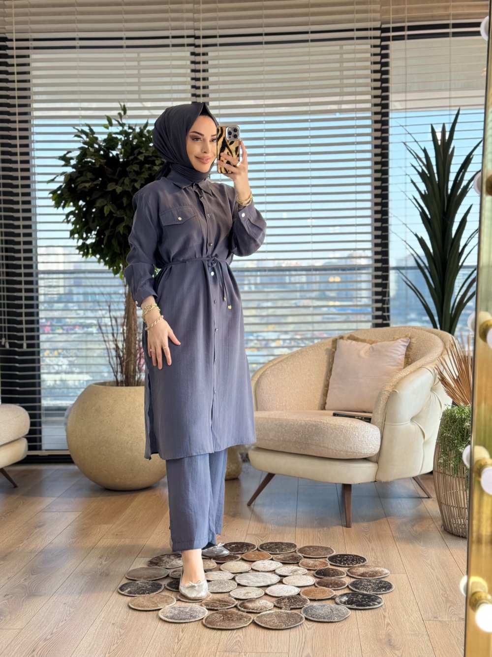 7513 Uzun Tunik Tek Cepli Takım Gri