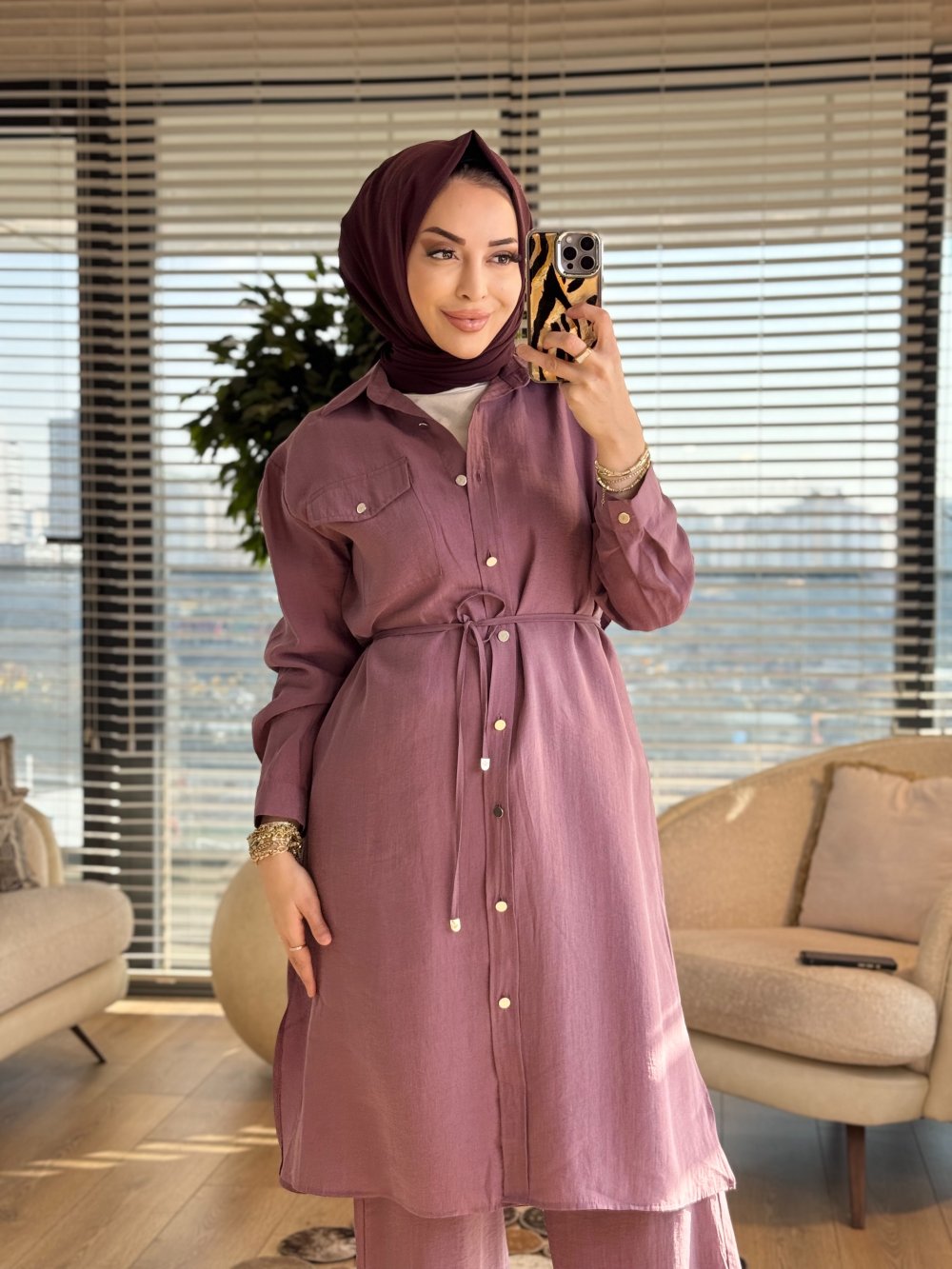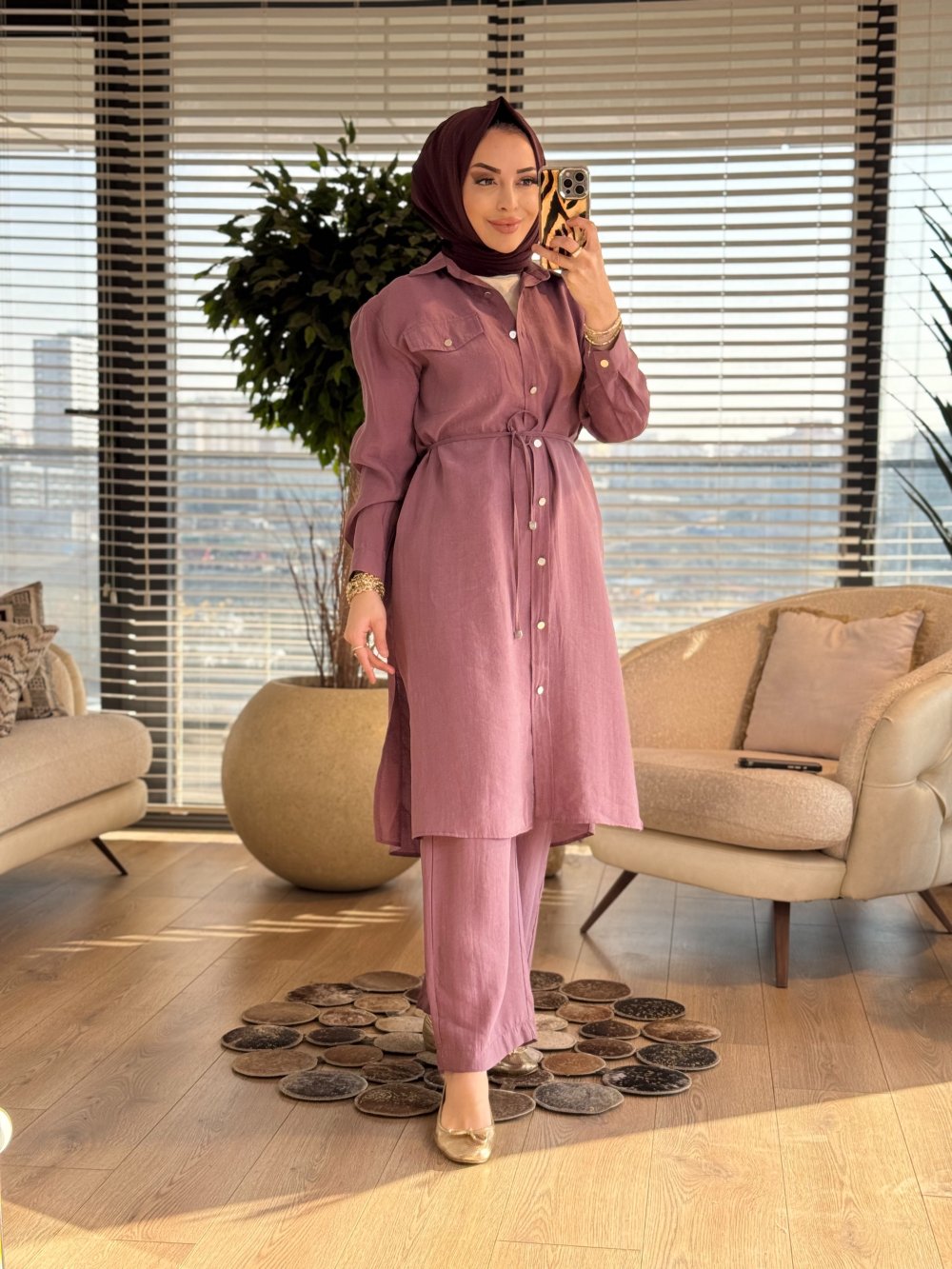7513 Uzun Tunik Tek Cepli Takım Gül