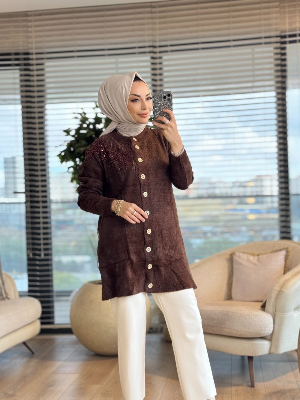 7701 Angora Boncuklu Oversize Hırka Kahve