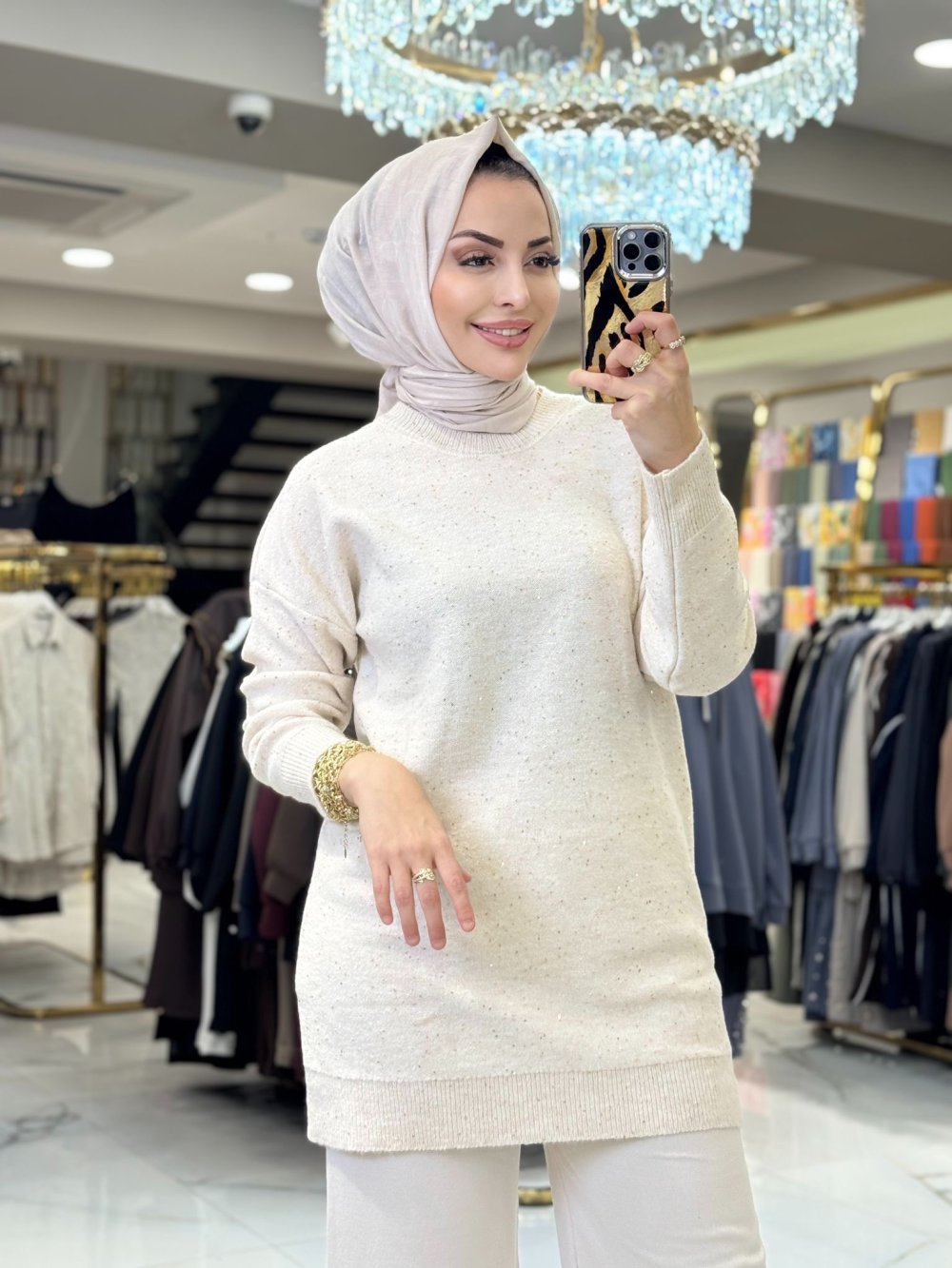 7765 Simli Ve Pullu Triko Tunik Bej
