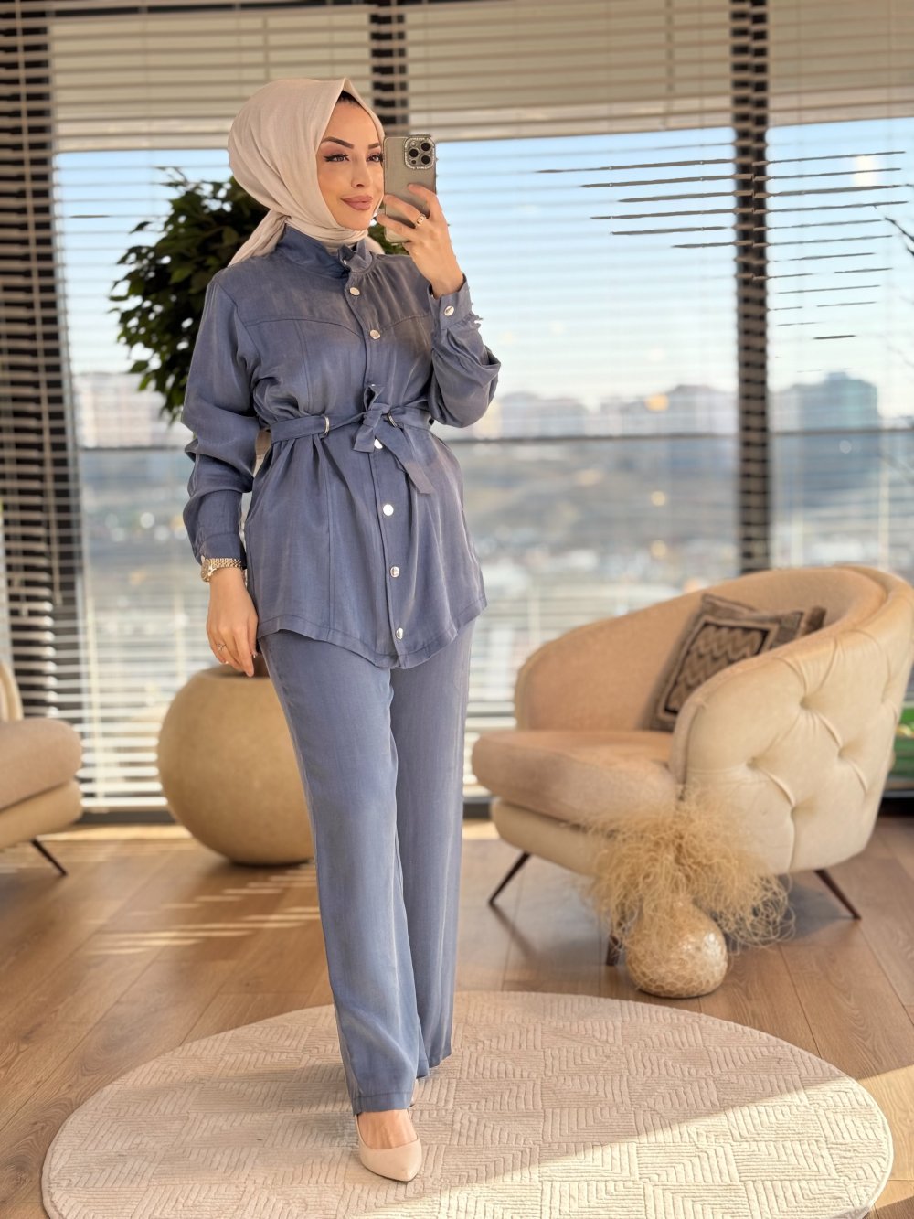 8514 Ön Çıtçıtlı Bel Kuşaklı Takım İndigo