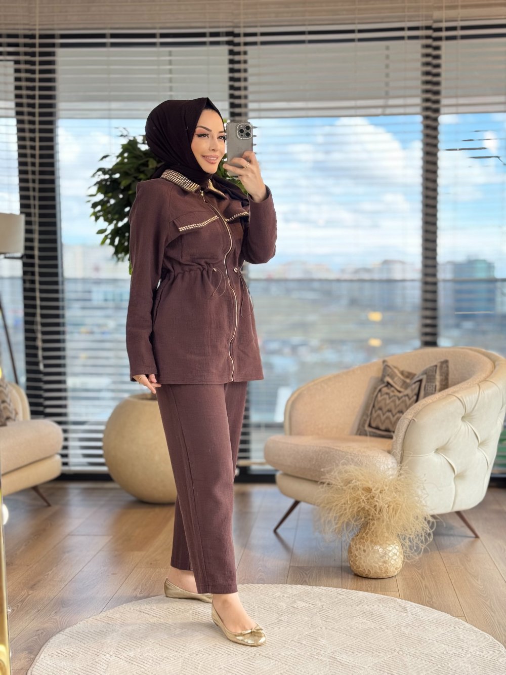 8518 Yaka Cep Kapağı Zımbalı Takım Kahve