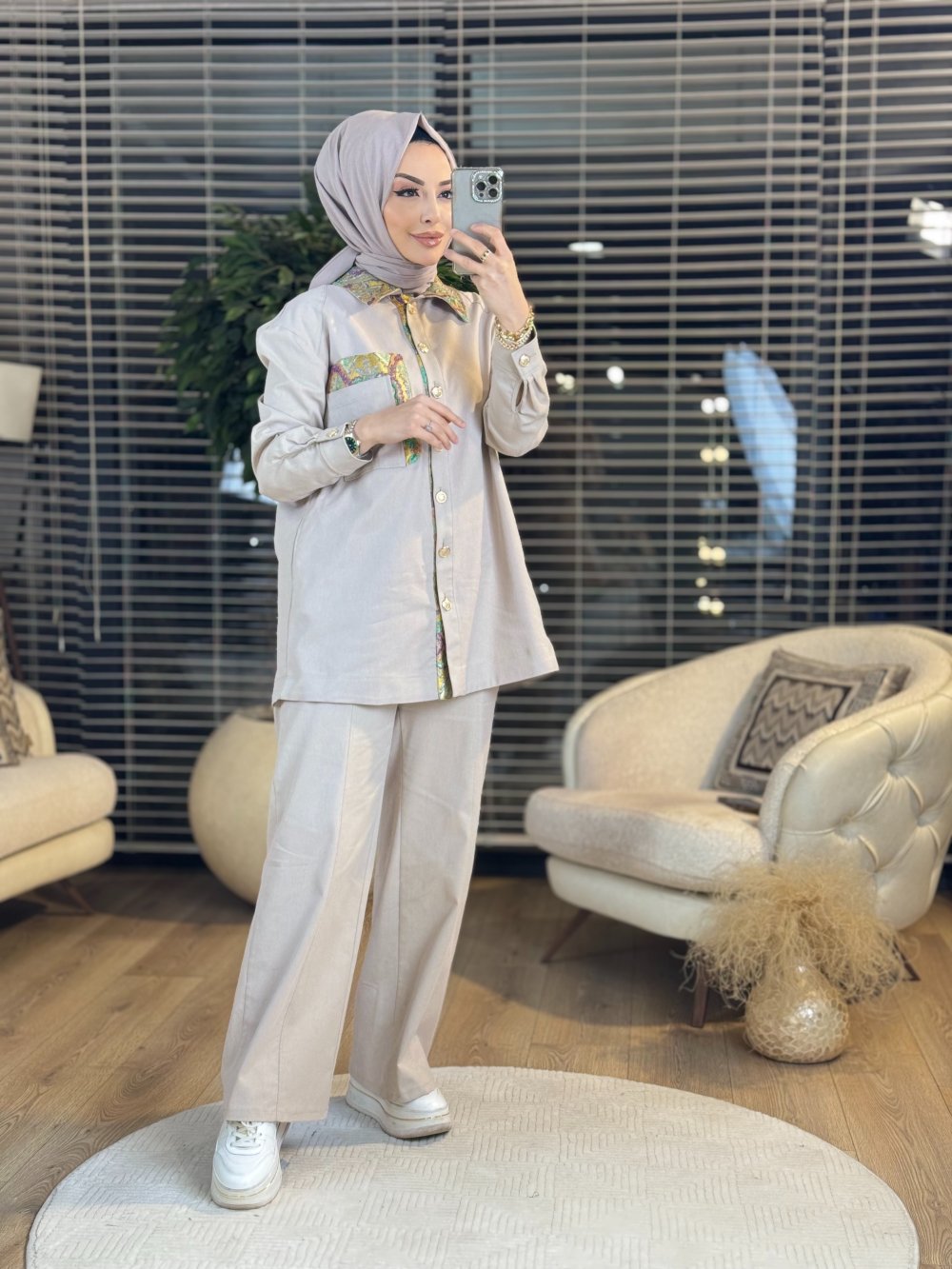 8538 Yaka Ve Cep Kenarı Desenli Takım Bej