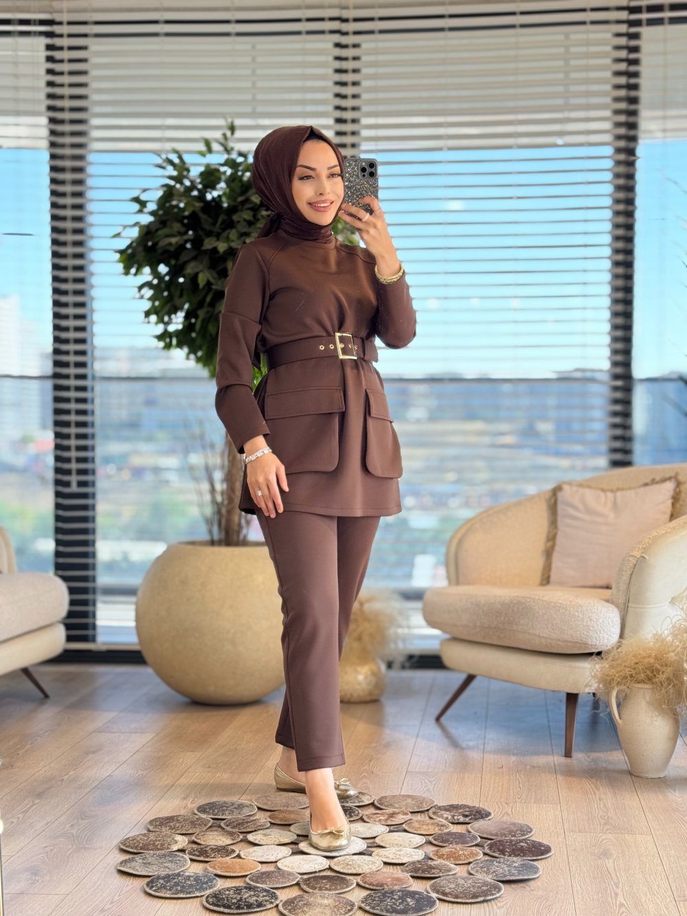 8566 Ön İki Cepli Kemerli Takım Kahve