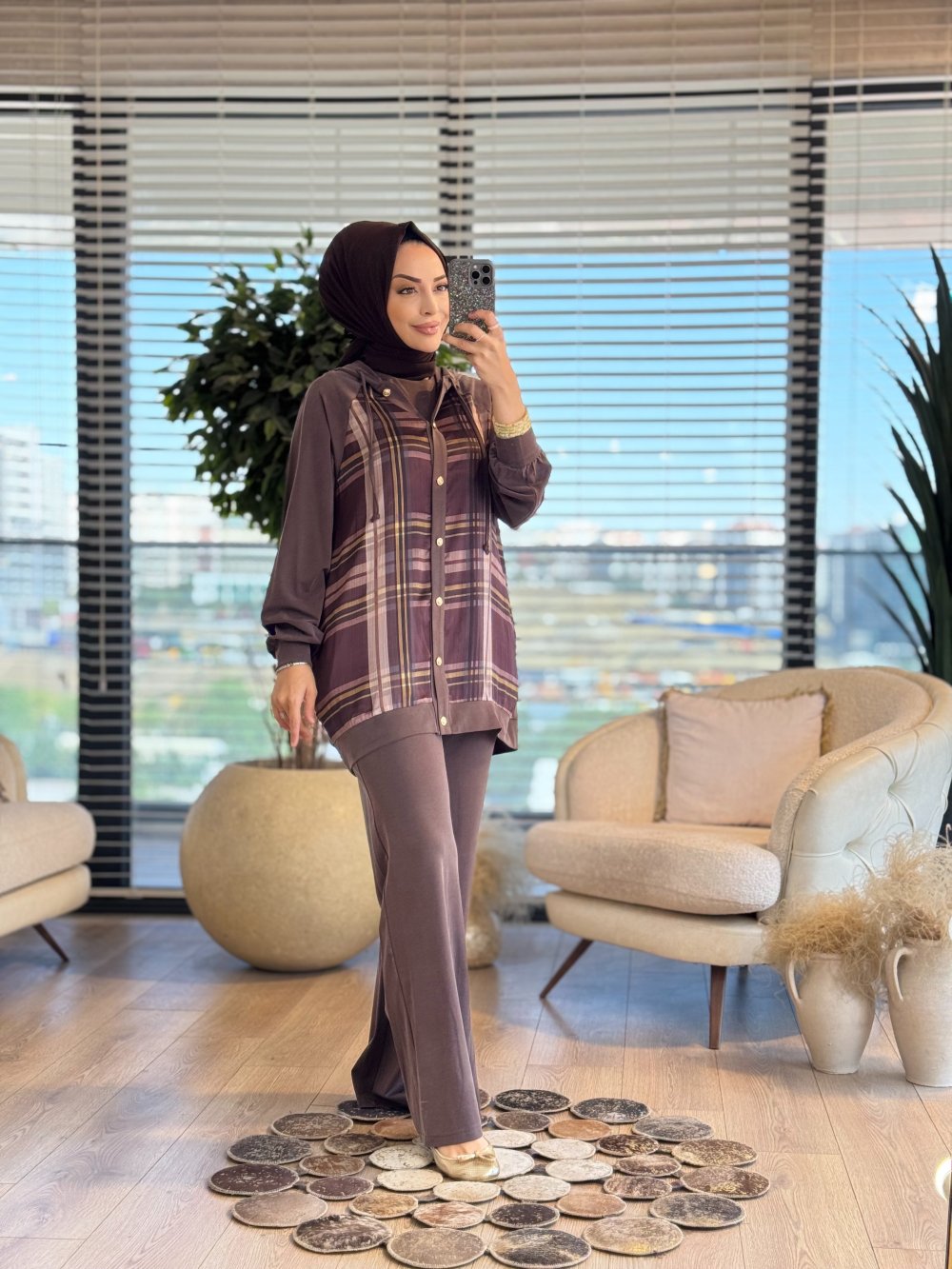 8568 Önü Ekose Desen Parçalı Takım Kahve