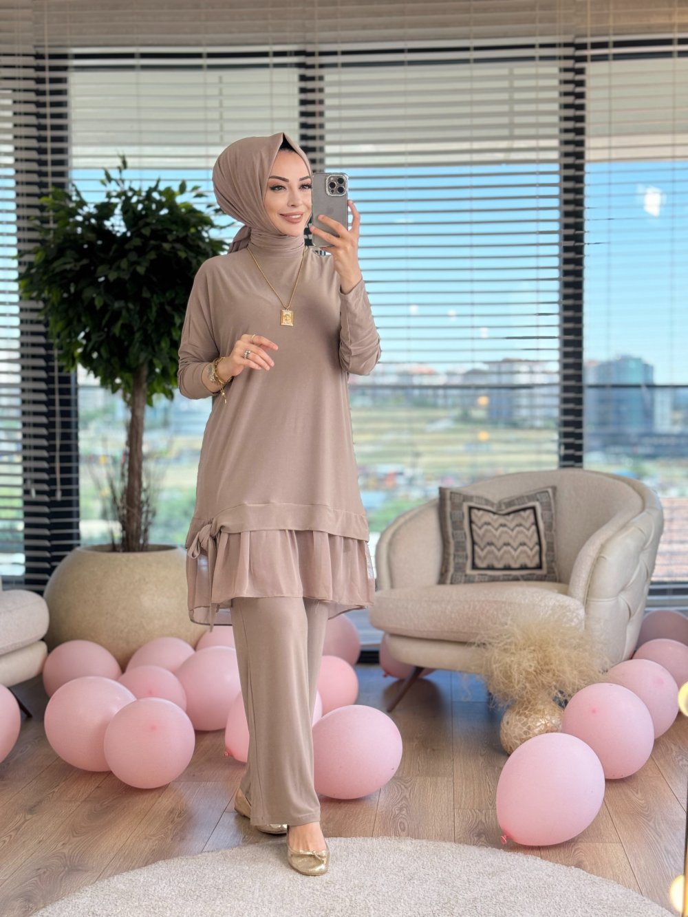 9063 Eteği Tül Ve Bağlamalı Takım Bej
