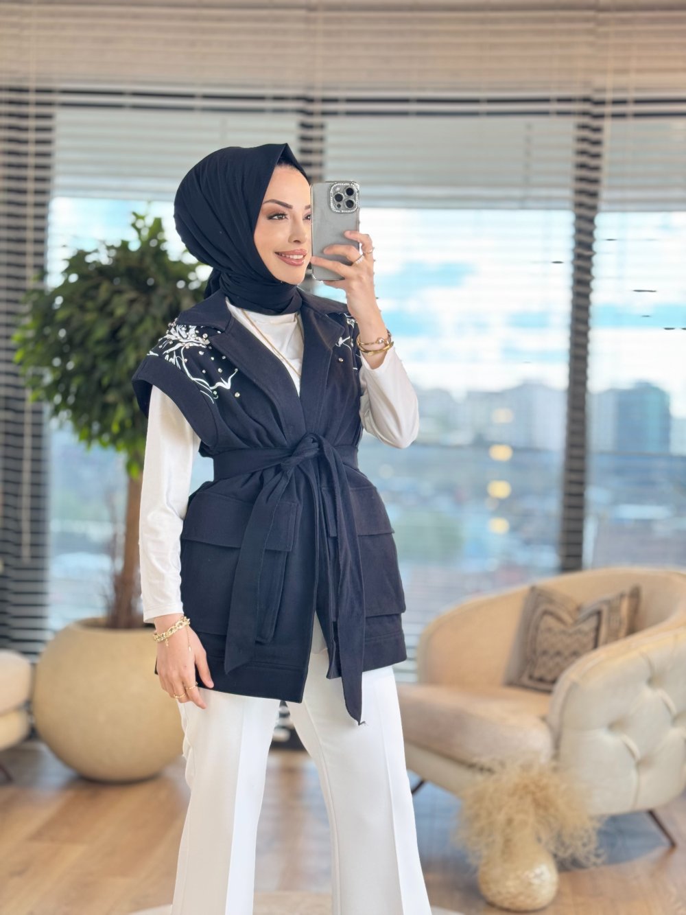 9246 Omuzları Dal Desenli Yelek Siyah