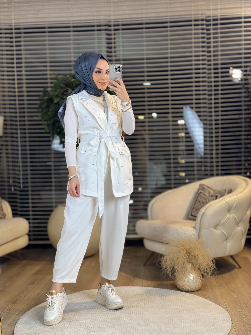 9249 Üstü İnci İşlemeli Yelek Ekru