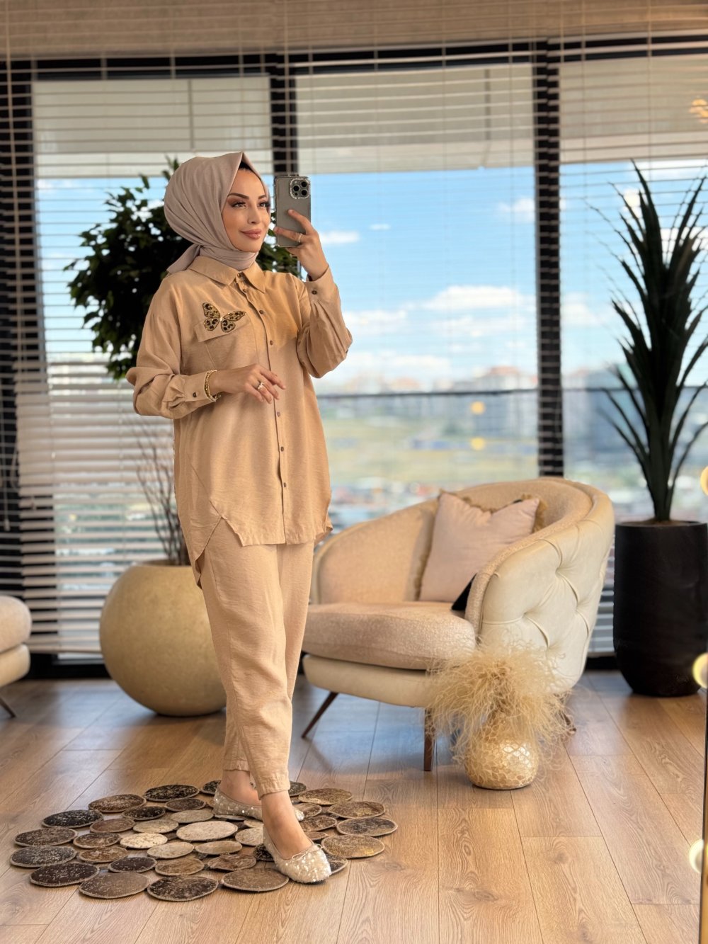 9758 Cebi Kelebek Broş İşli Takım Bej