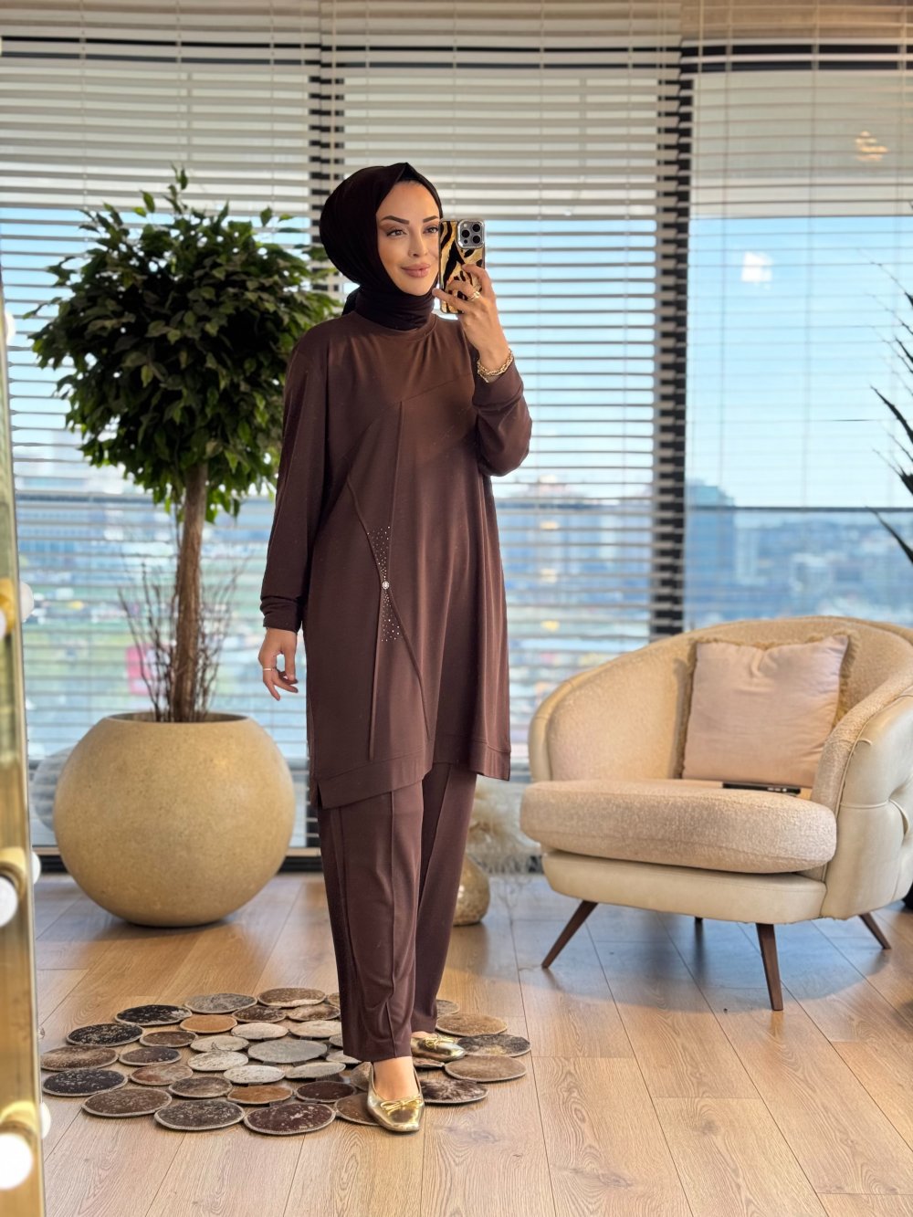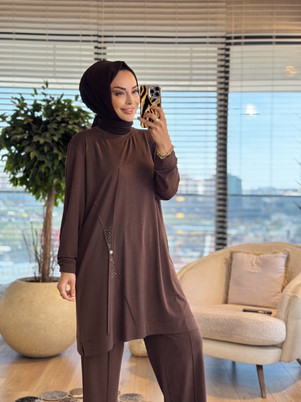 9894 Ön Dikiş Ve Taş Detaylı Takım Kahve