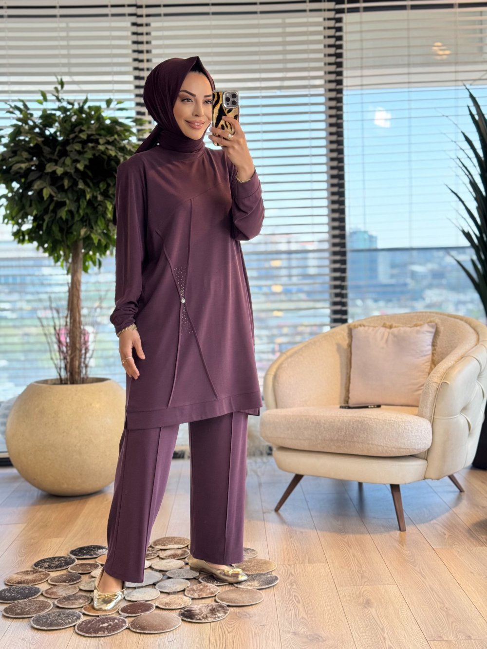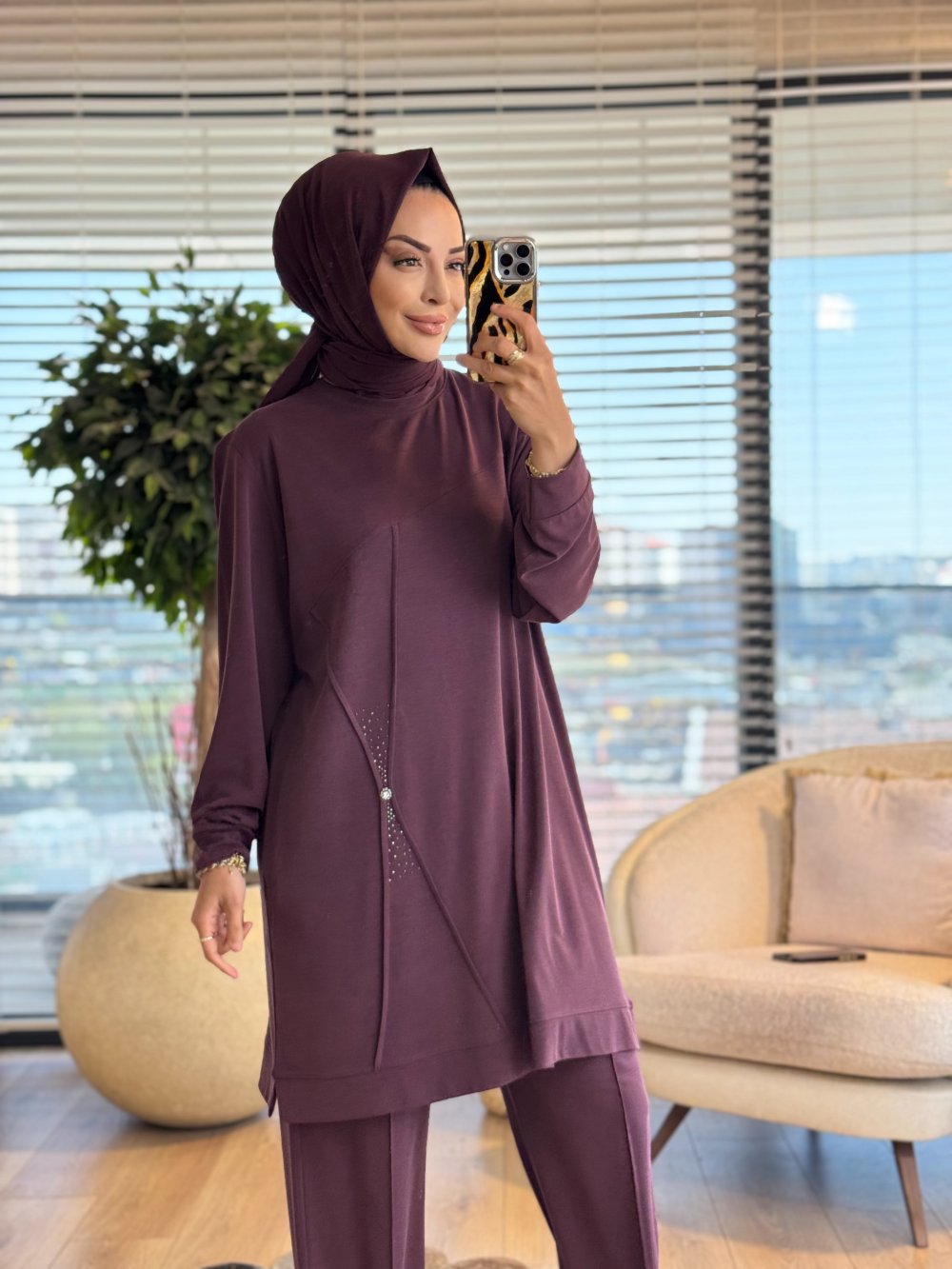9894 Ön Dikiş Ve Taş Detaylı Takım Mürdüm