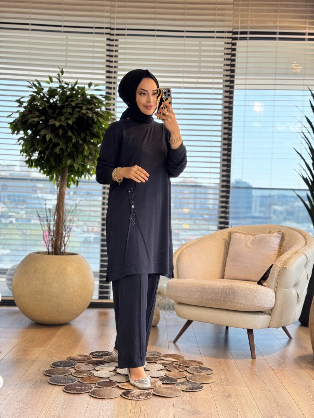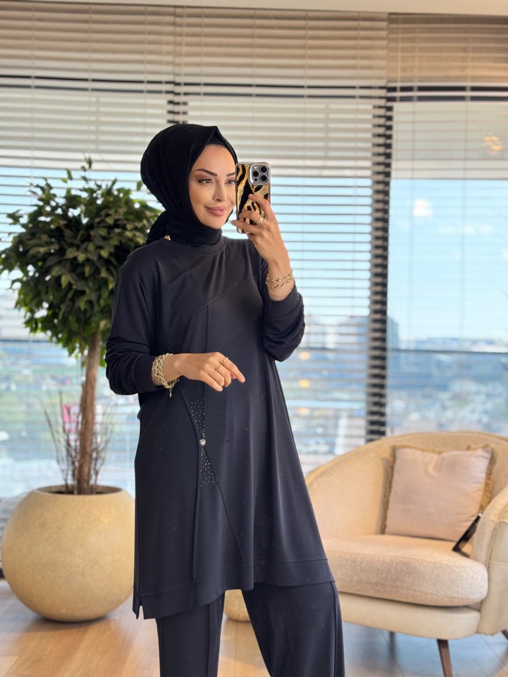9894 Ön Dikiş Ve Taş Detaylı Takım Siyah