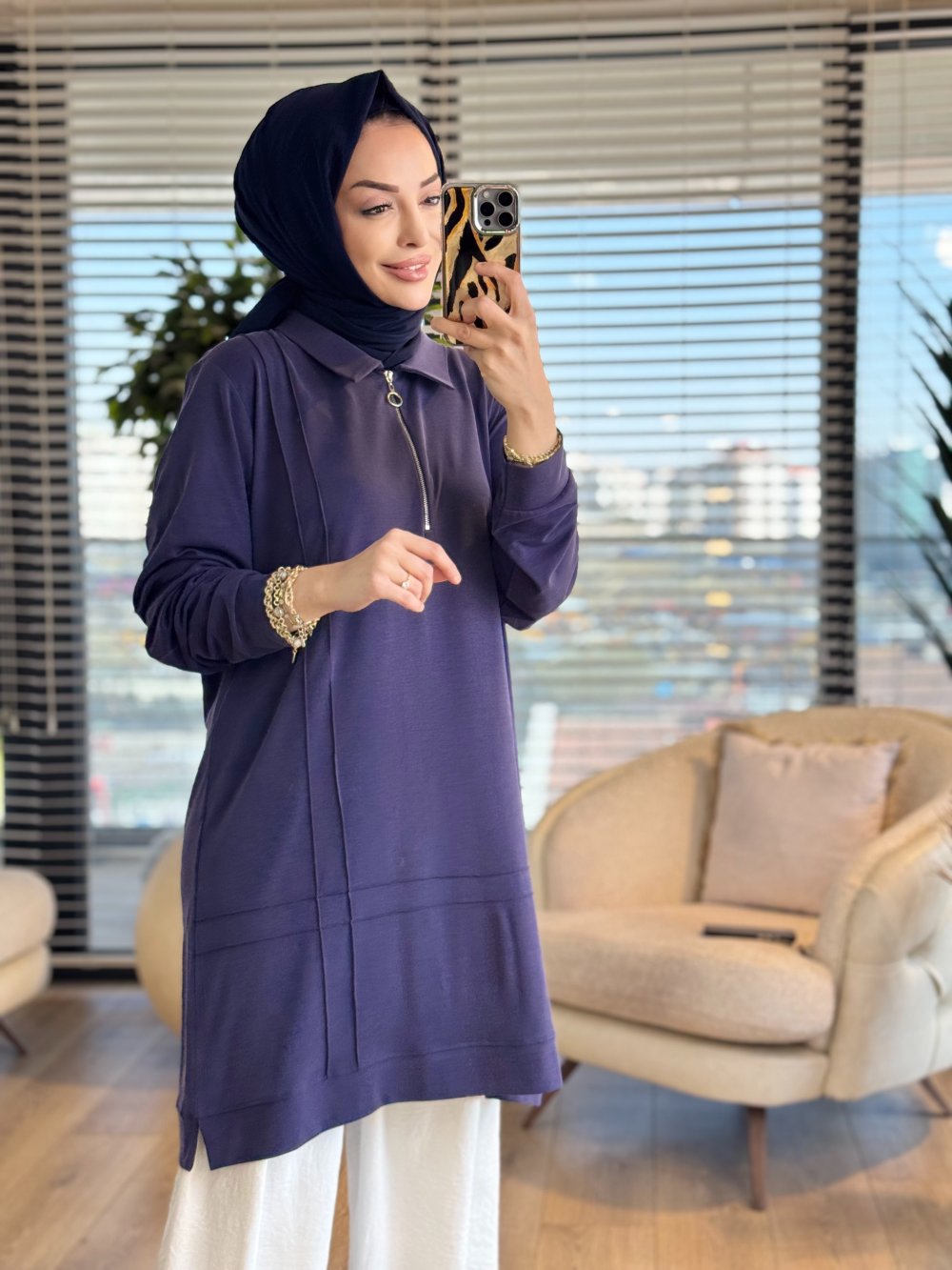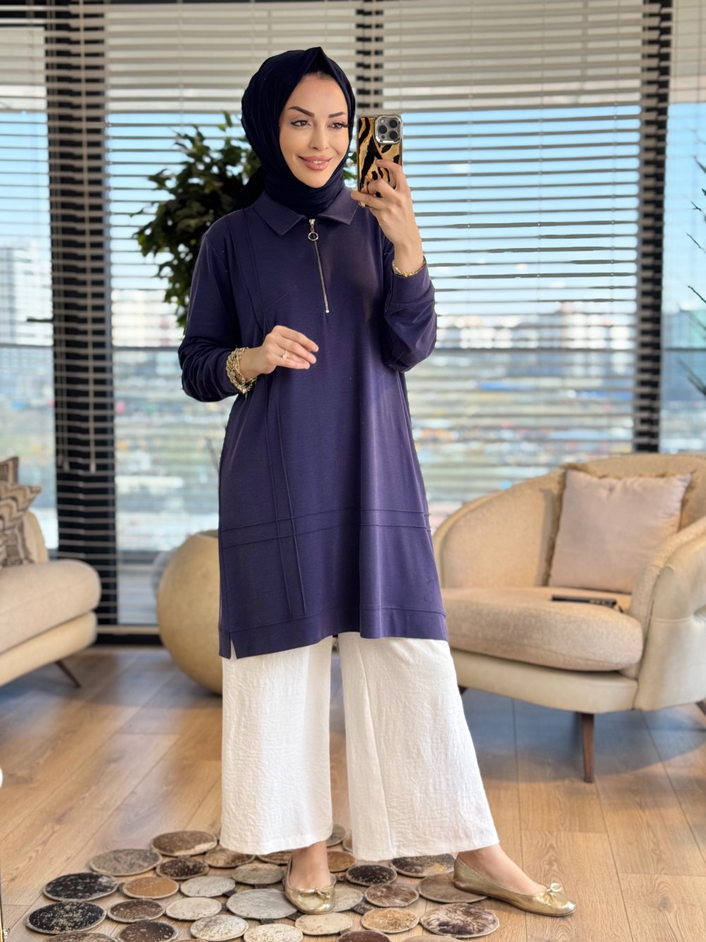 9910 Önü Kordon Biye Detaylı Tunik İndigo