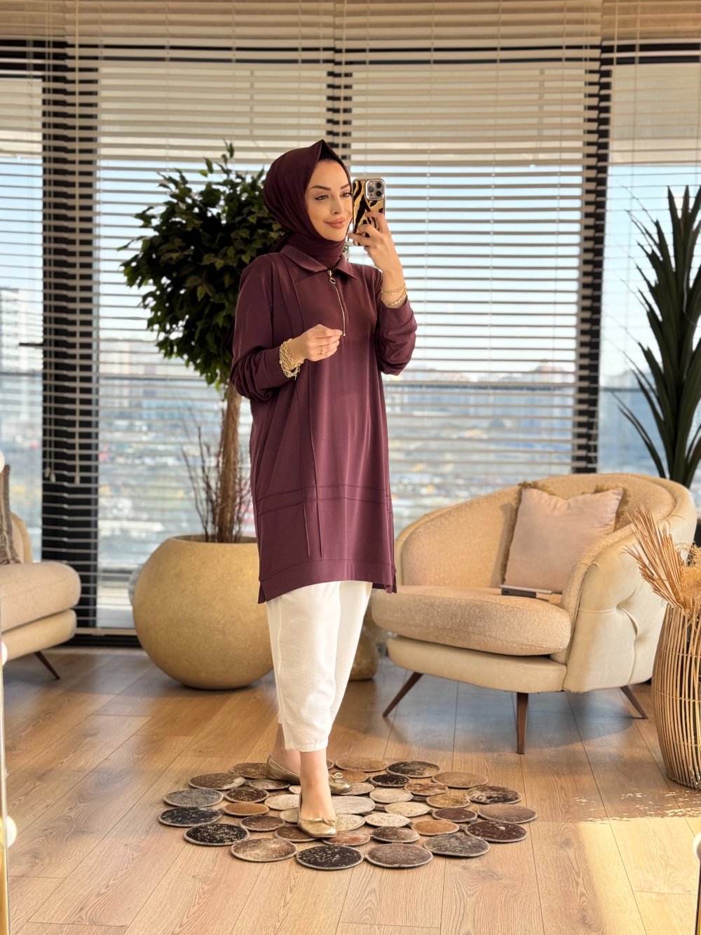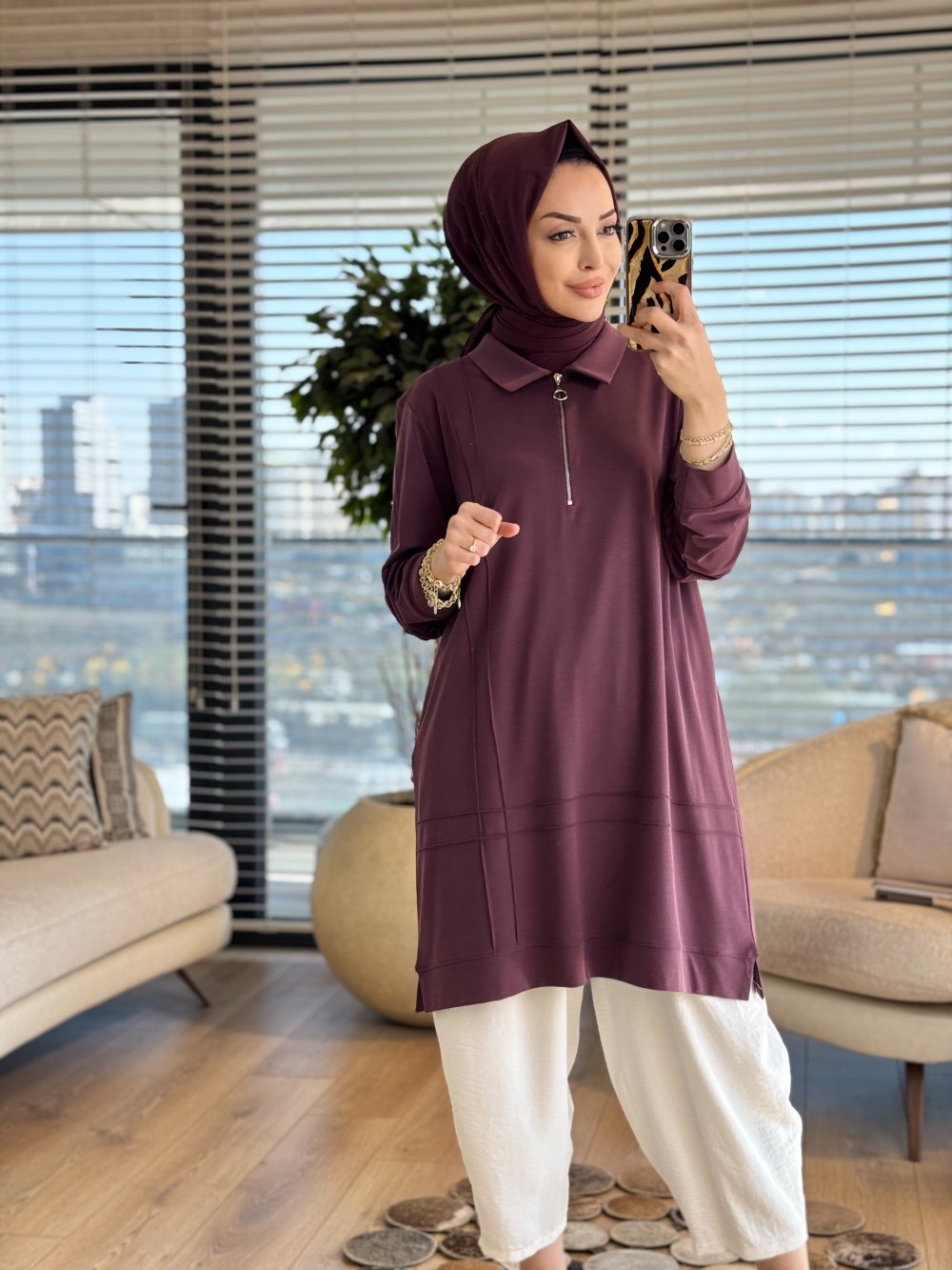 9910 Önü Kordon Biye Detaylı Tunik Mürdüm
