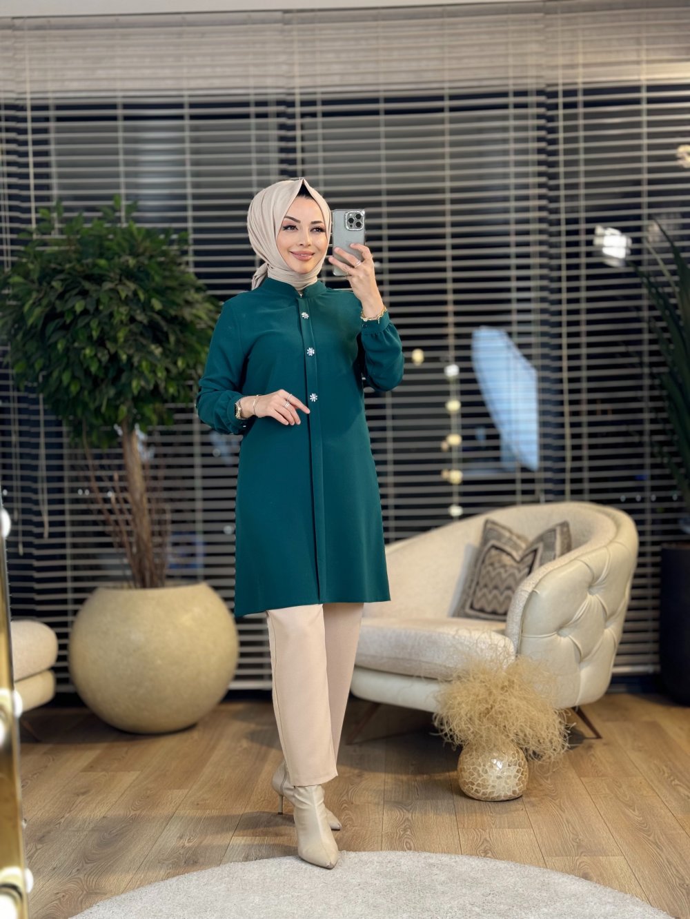 A1409 Patı Taş Düğmeli Tunik Zümrüt