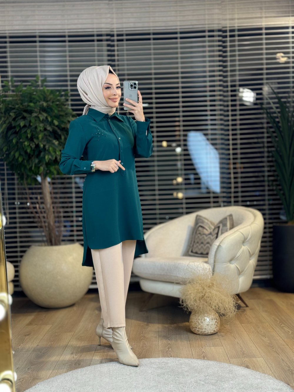 A1411 Krep Arkası Yıldızlı Tunik Zümrüt
