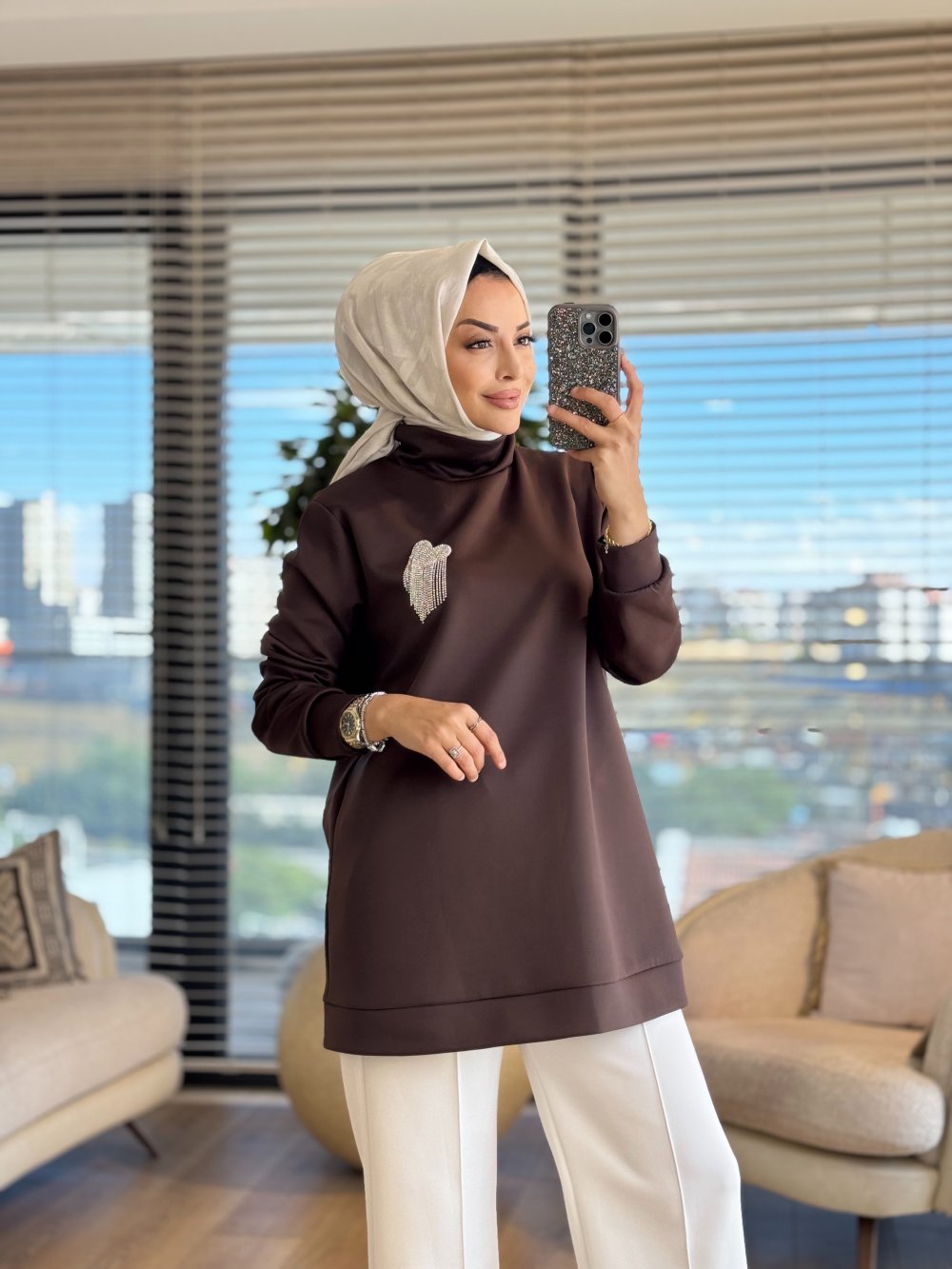 HWN9025 Kalp Broşlu Scuba Sweat Kahve