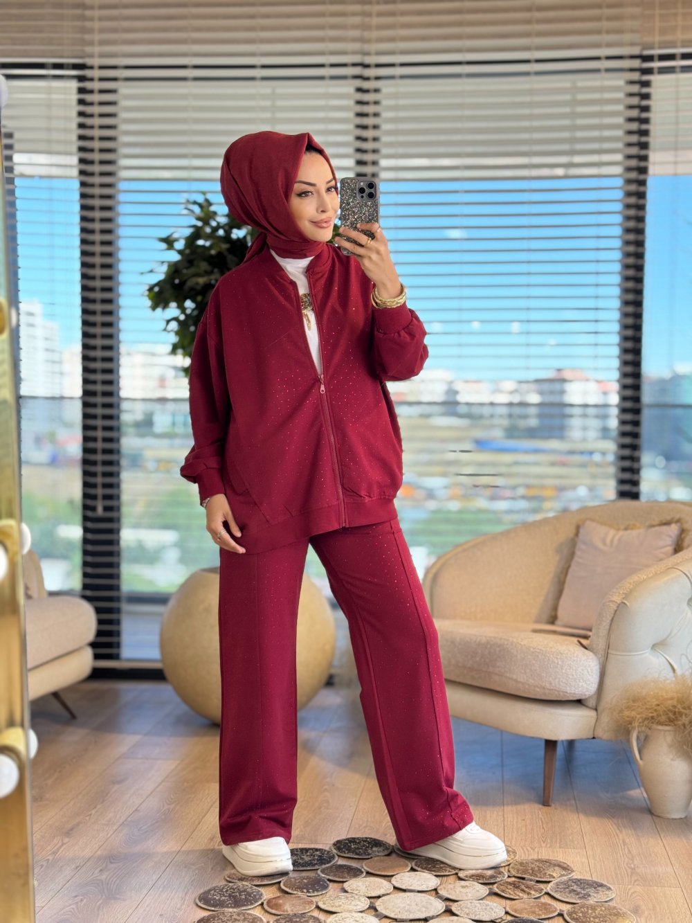 MRW1593 Önü Taşlı Pantolonlu Takım Bordo