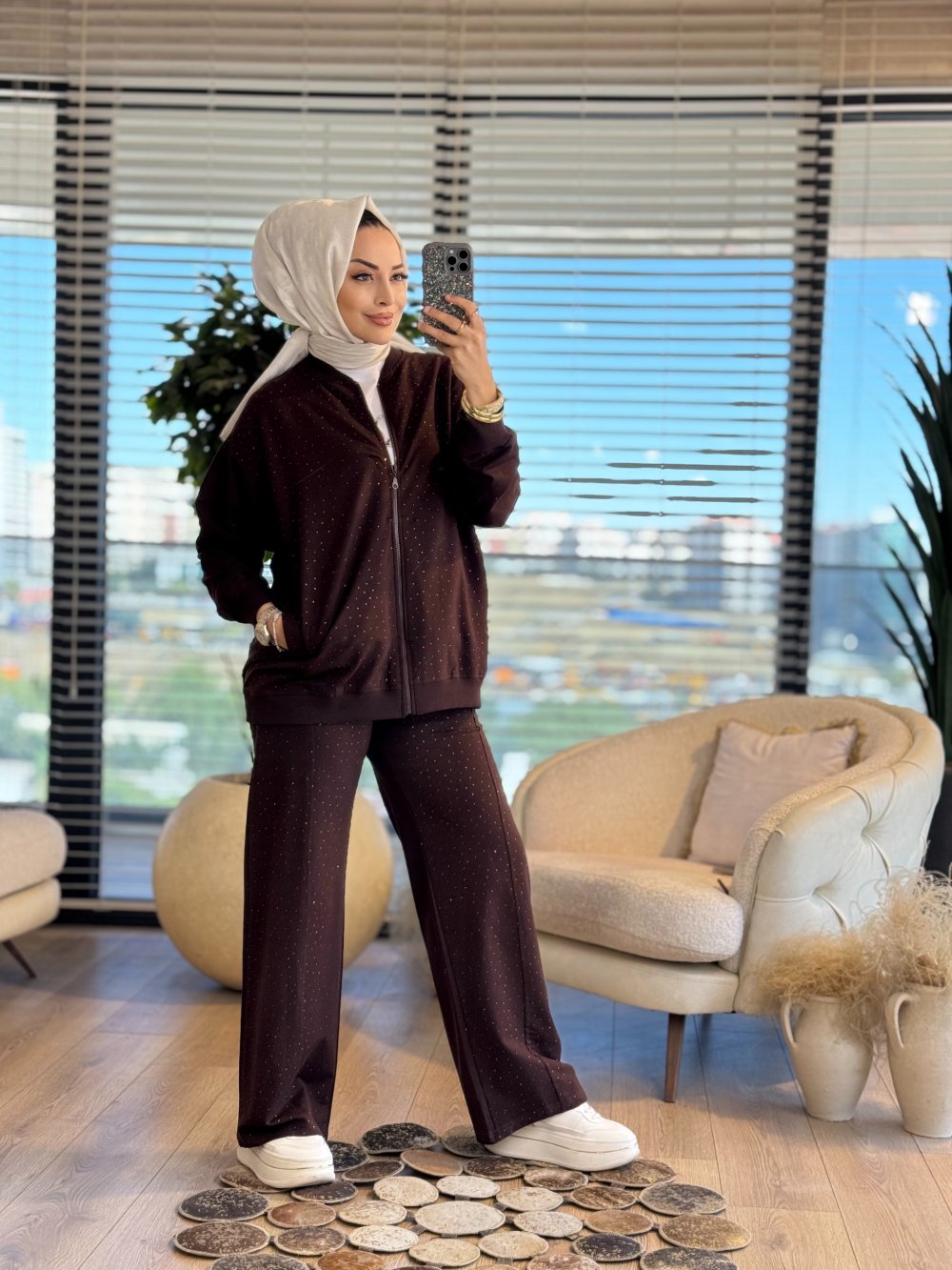 MRW1593 Önü Taşlı Pantolonlu Takım Kahve