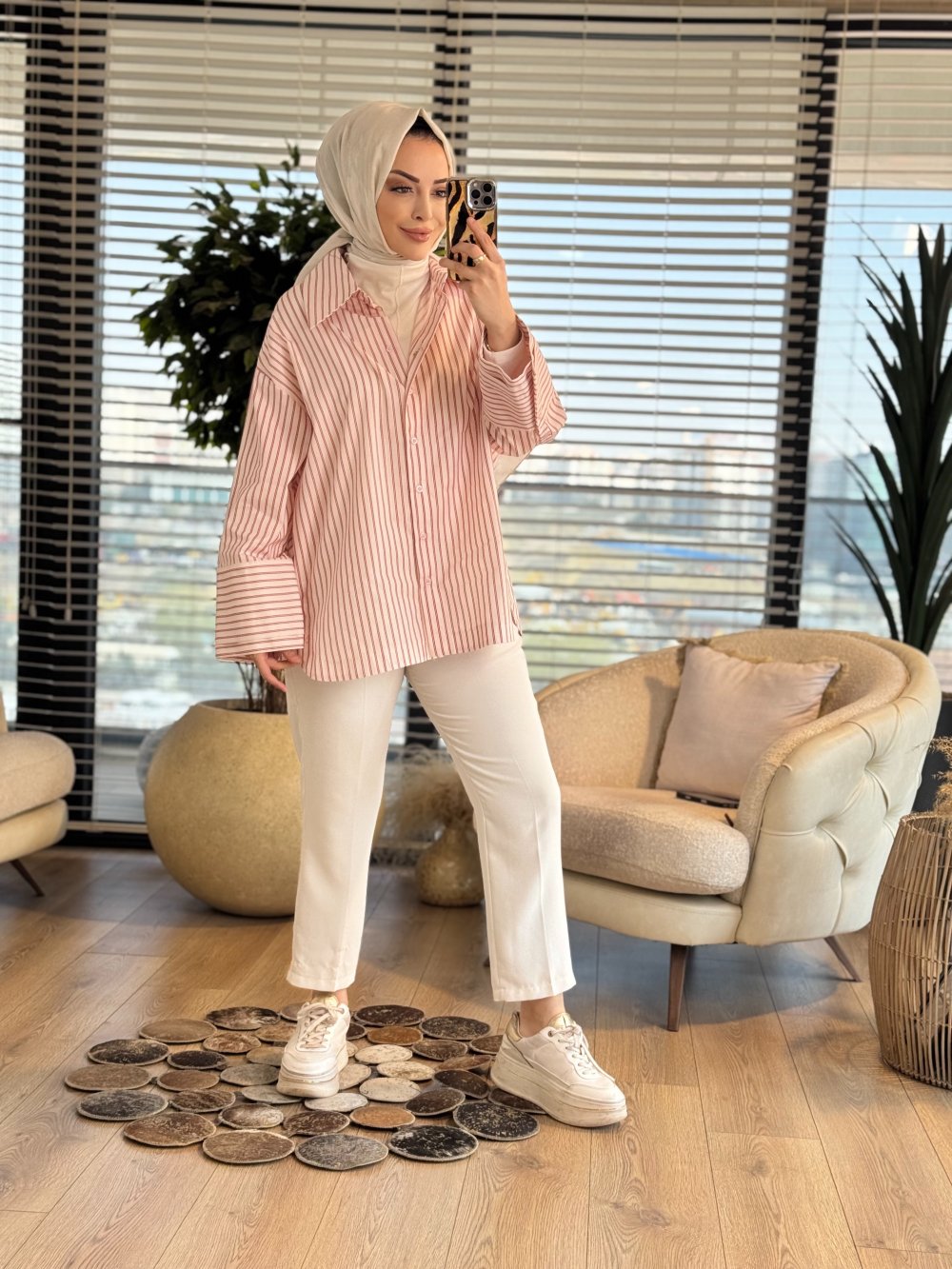 MRW1688 Çizgili Poplin Gömlek Ekru