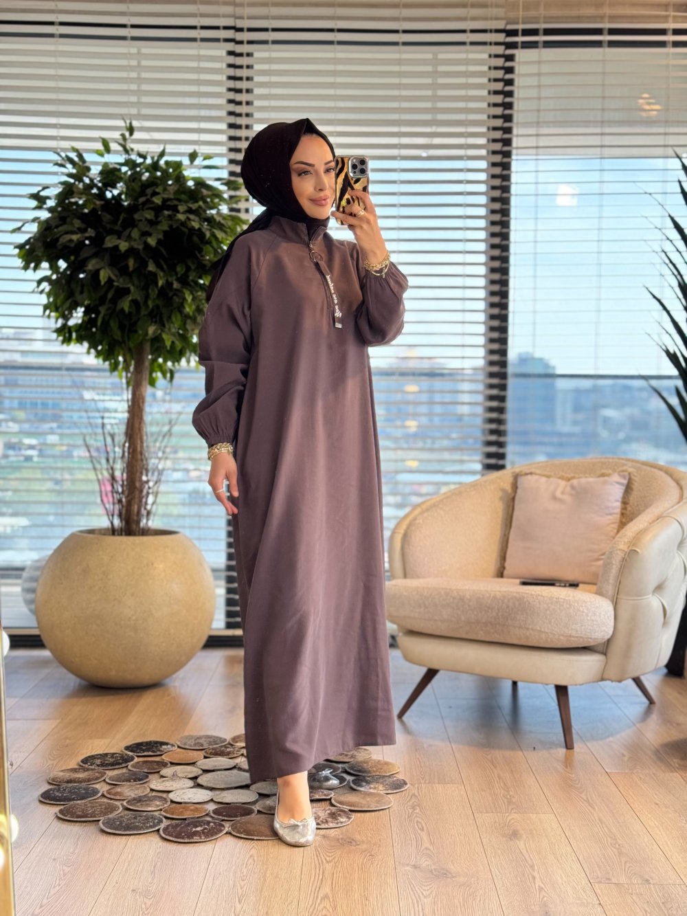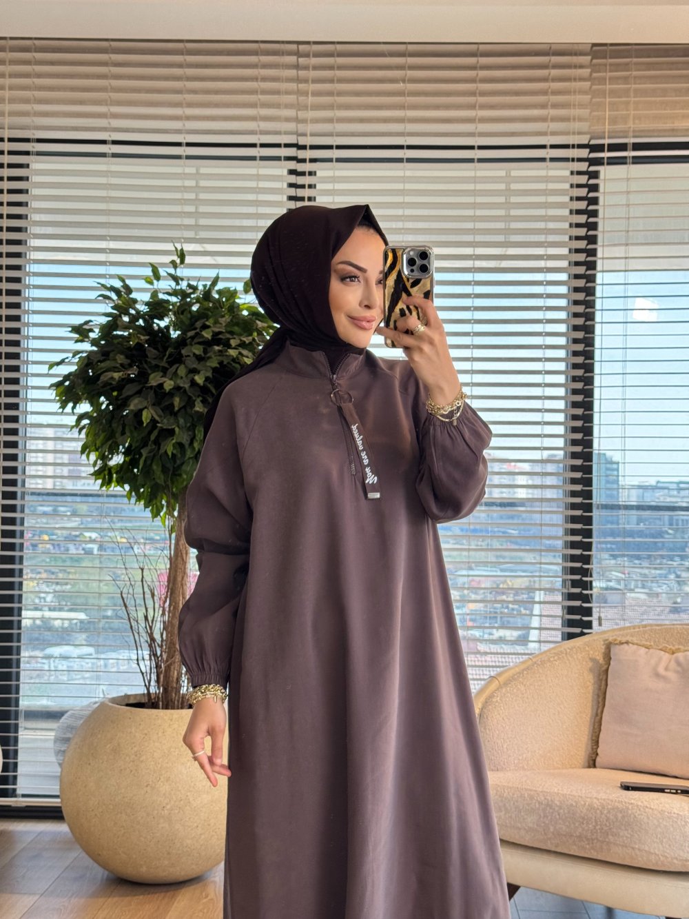 S5935 Dik Yaka Ferah Elbise Kahve