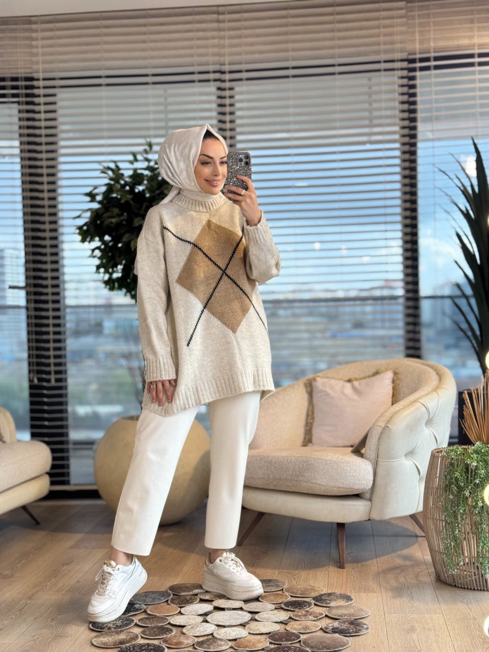 T8508 Önü Zikzak Desenli Triko Tunik Vizon